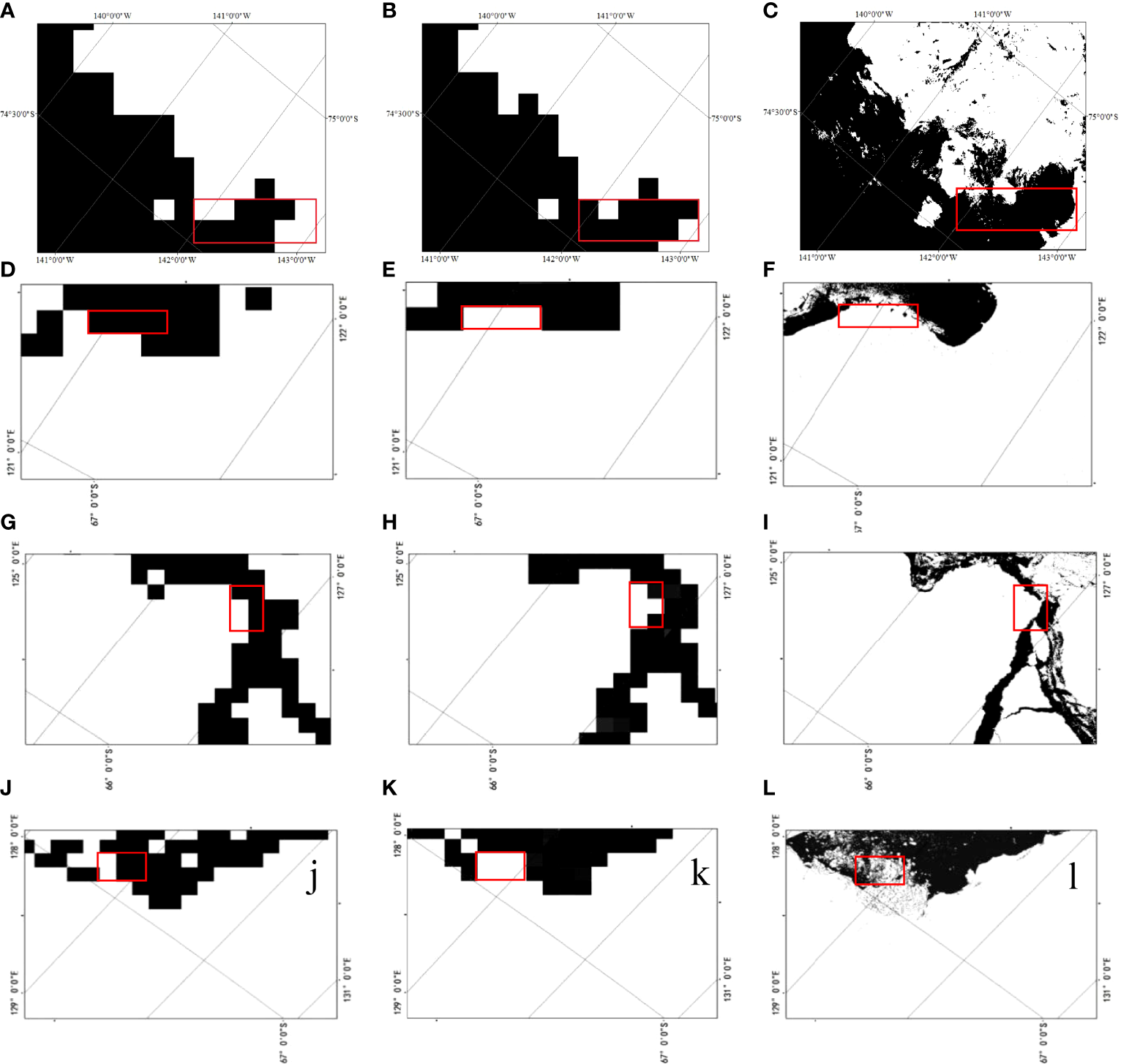 (A) Sea ice distribution was obtained by the ASI algorithm on February 1, 2020 (B) Sea ice distribution was obtained by the improved ASI algorithm based on CGAN on February 1, 2020 (C) Sea ice distribution was obtained by the Landsat8 OLI-L1T data through the NDSI method on February 1, 2020. (D) Sea ice distribution was obtained by the ASI algorithm on October 16, 2019 (E) Sea ice distribution was obtained by the improved ASI algorithm based on CGAN on October 16, 2019 (F) Sea ice distribution was obtained by the Landsat8 OLI-L1T data through the NDSI method on October 16, 2019. (G) Sea ice distribution was obtained by the ASI algorithm on November 10, 2019 (H) Sea ice distribution was obtained by the improved ASI algorithm based on CGAN on November 10, 2019 (I) Sea ice distribution was obtained by the Landsat8 OLI-L1T data through the NDSI method on November 10, 2019. (J) Sea ice distribution was obtained by the ASI algorithm on March 6, 2020 (K) Sea ice distribution was obtained by the improved ASI algorithm based on CGAN on March 6, 2020 (L) Sea ice distribution was obtained by the Landsat8 OLI-L1T data through the NDSI method on March 6, 2020 (Projection: polar stereographic projection; The white area is sea ice, and the black area is sea water).
