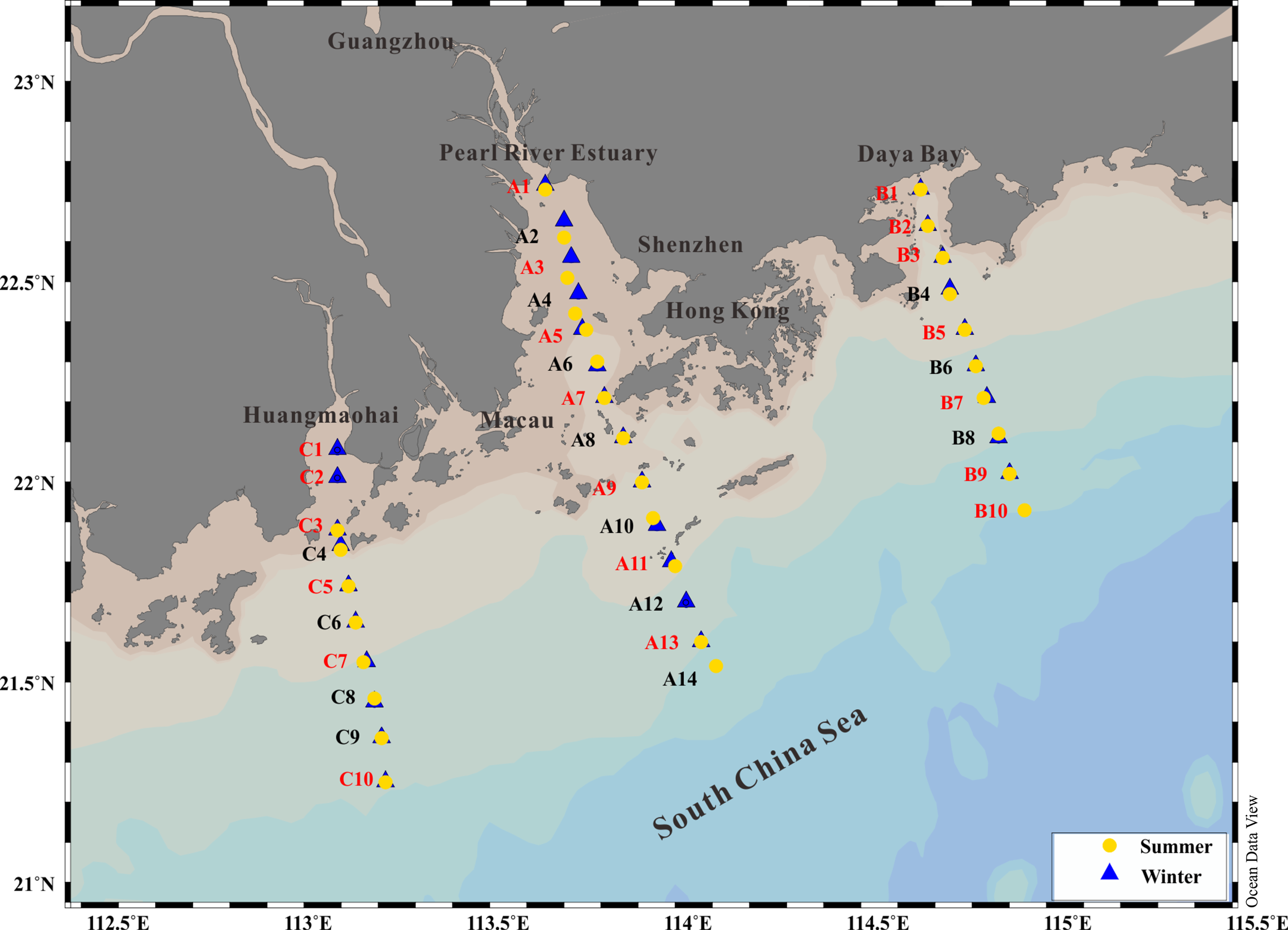 In this study, we carried out the experiments in 3 transactions located in the PRE (A1-A14), Daya Bay (B1–B10), and Huangmaohai Bay (C1–C10) during wet (summer; July 14–24, 2019); and dry seasons (winter; December 8–18, 2020) (Figure 1). During the two investigations, the profiles of temperature, salinity, dissolved oxygen (DO), pH, turbidity, nutrients, and chlorophyll a (Chl a) concentration were obtained at all the 34 stations; and the cell size-fractionated Chl a, GPP, CR, and NCP in surface and bottom layers were measured at 20 of the 34 stations (labeled in red color). The seawater in the surface (~0.5 m depth), 5, 10, 15, 20, 30, 50 m, and bottom layers were collected with an acid-cleaned (1N HCl) 5-L polycarbonate bucket for Chl a and nutrient analysis as described below.