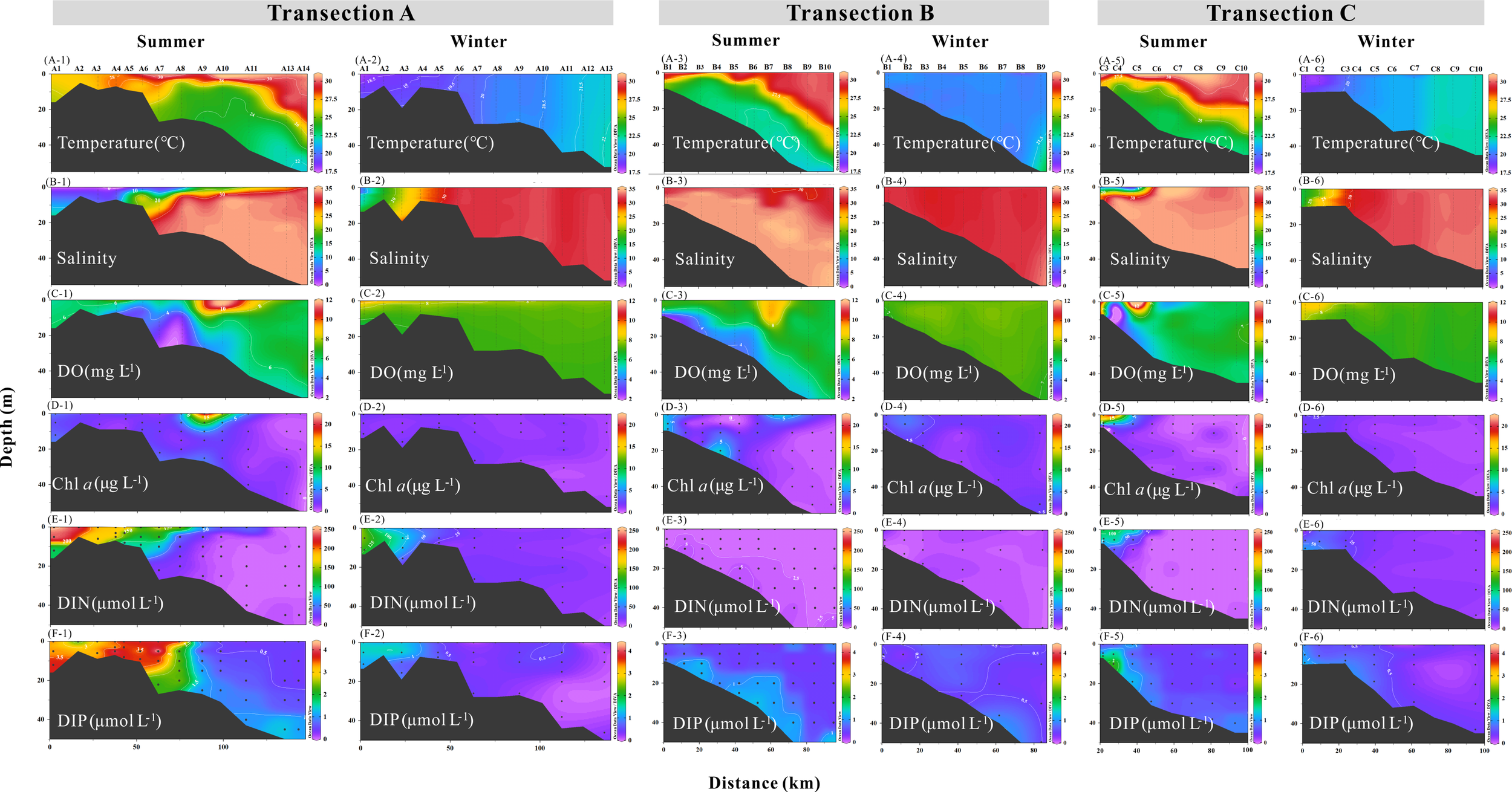 Vertical distributions of temperature (A, °C), salinity (B), DO (C, mg L-1), Chl a concentration (D, μg L-1), DIN (E, μmol L-1), and DIP (F, μmol L-1) along the transections A, B, and C in summer and winter periods.