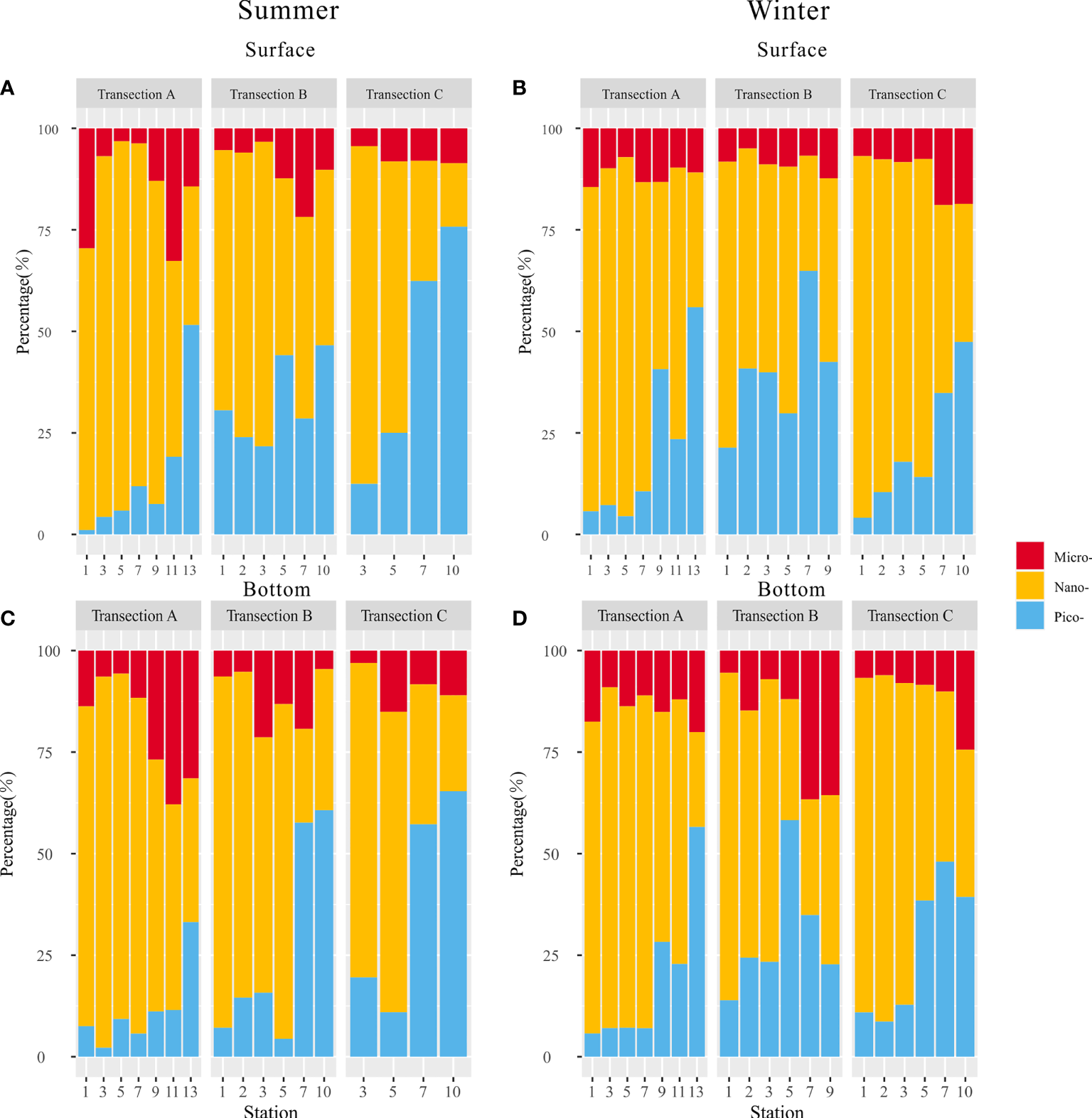 Contribution (%) of three cell size-fractioned Chl a in surface and bottom seawater along transections (A–C) of the GGBA in summer (A–C) and winter (B, D) periods.