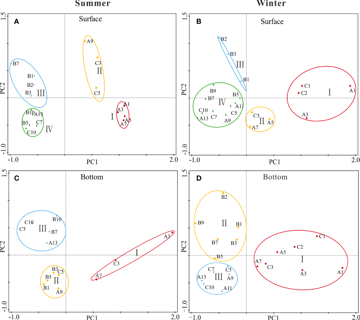 PCA results of environmental and biological characteristics in surface (A, B) and bottom (C, D) seawater along transections (A–C) of the GGBA in summer (A, C) and winter (B, D) periods.
