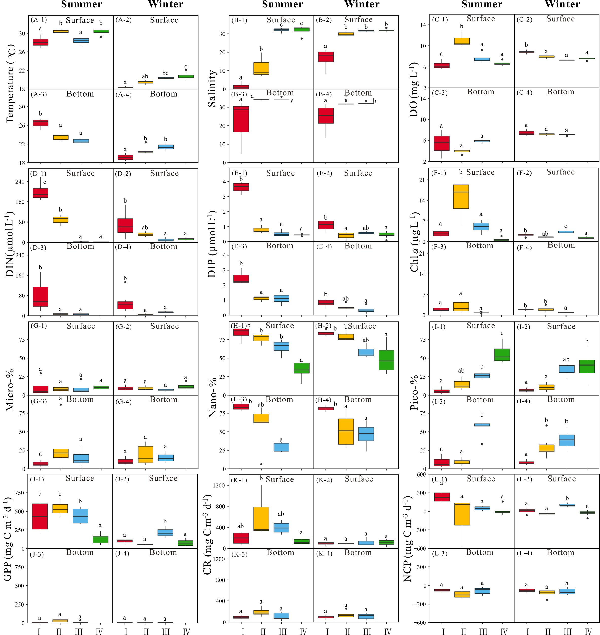 Regional variance of temperature (A, °C), salinity (B), DO (C, mg L-1), DIN (D, μmol L-1), DIP (E, μmol L-1), Chl a concentration (F, μg L-1), Micro-% (G), Nano-% (H), Pico-% (I), GPP (J, mg C m-3 d-1), CR (K, mg C m-3 d-1) and NCP (L, mg C m-3 d-1) in surface (-1, -2) and bottom (-3, -4) layer along transections of the GGBA in summer (-1, -3) and winter (-2, -4) periods. Different letters in each box plot indicate the significant differences among different groups (Turkey' HSD test, p < 0.05)