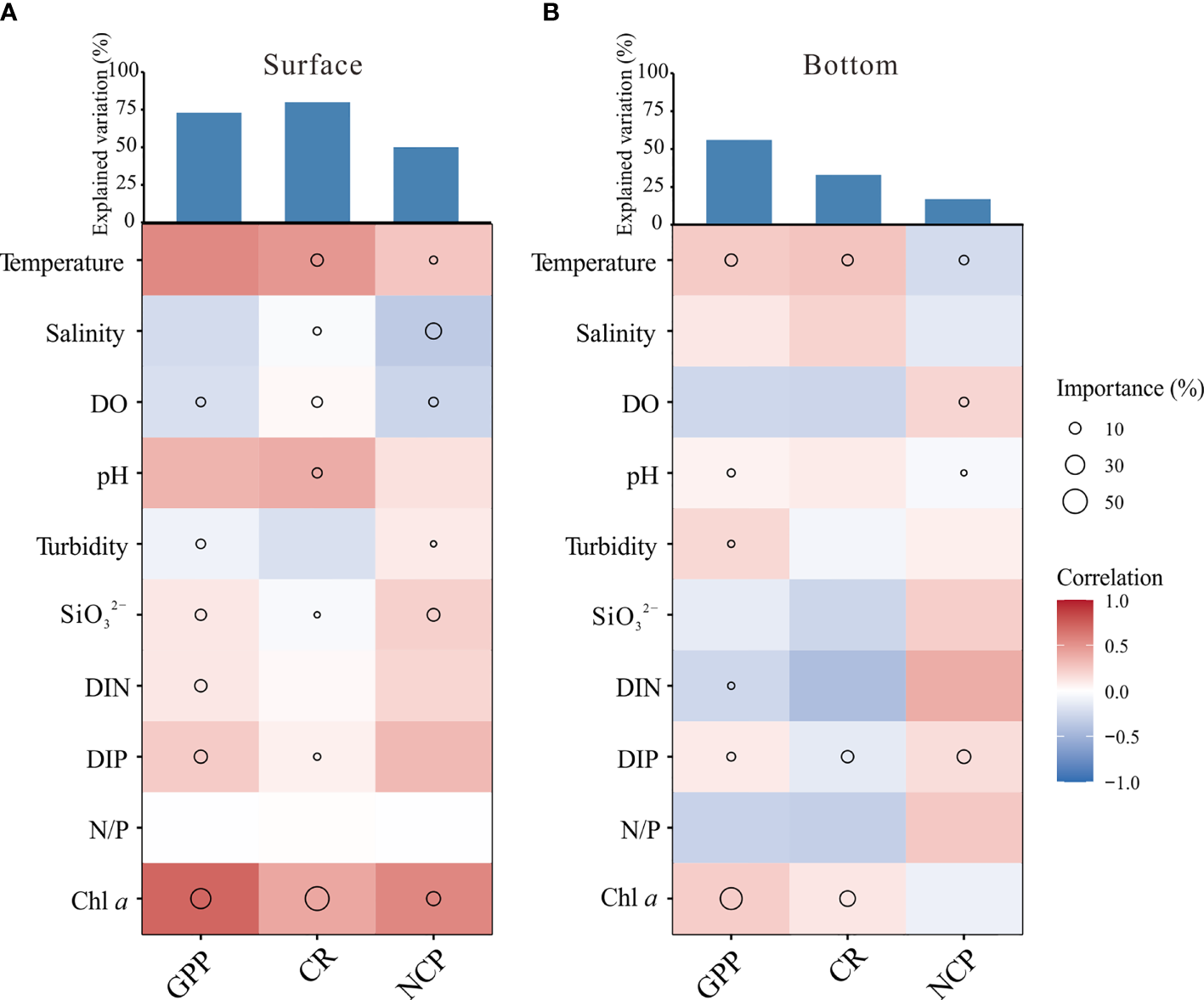 Contribution of environmental factors to variation of GPP, CR, and NCP based on optimal multiple regression model in (A) surface and (B) bottom layers. The above bar graph indicates the total contribution, and the heat plot indicates the Spearman correlation coefficients. The size of circles indicates the importance of environmental variables.