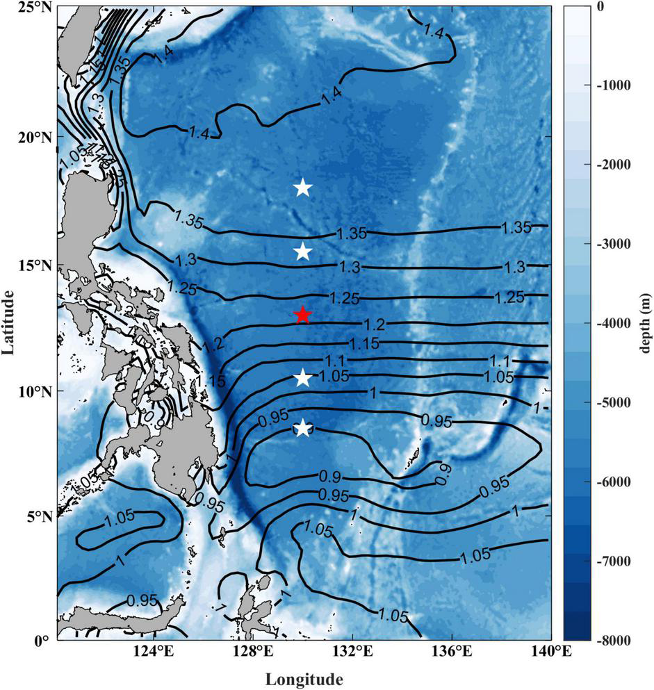 Figure 1. Locations of ADCP moorings deployed by Institute of Oceanology, Chinese Academy of Sciences at 130°E (the mooring used in this study is marked by red pentagram). The color map shows the topography of the WTP derived from the etopo2v2 dataset. Contours show the mean sea surface height from satellite altimetry (AVISO).