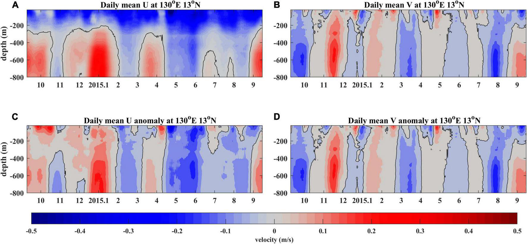Figure 2. Daily mean velocities (A,B) and their anomalies (C,D) measured by the ADCP mooring at 13°N, 130°E.