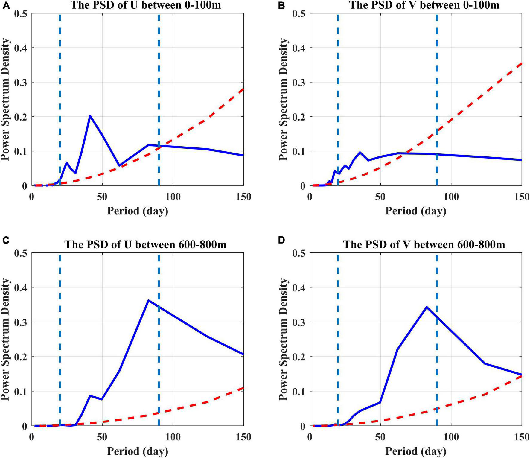 Figure 3. Power spectral density of the zonal (left) and meridional (right) velocity time series averaged between 0–100 m (A,B) and 600–800 m (C,D) derived from the mooring ADCP. The red dashed curves denote the 95% significance level, and the light blue dashed lines denote the period of 20- and 90-day.