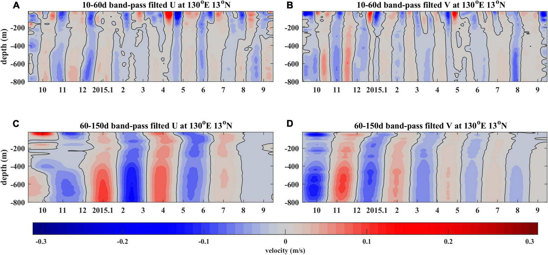 Figure 4. Daily mean zonal (A) and meridional (B) velocity anomalies after a 10–60 days band-pass filtering. (C,D) are the same as the upper panel, but for 60–150 days band-pass filtering.