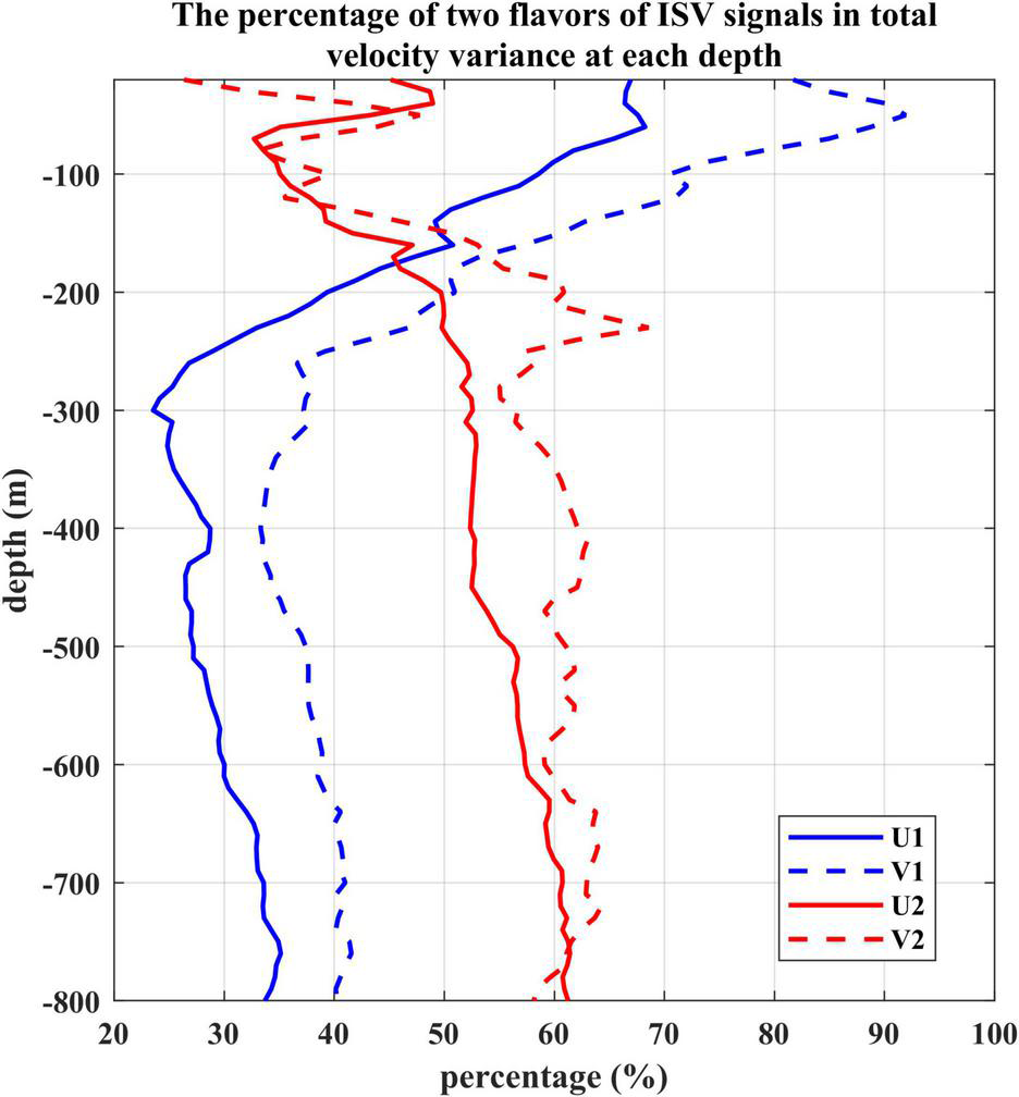 The percentage of two flavors of ISV signals in the total velocity variance at each depth derived from the mooring ADCP measurements. U1 and V1 indicate zonal and meridional velocities after 10–60 days band-pass filter. U2 and V2 indicate zonal and meridional velocities after 60–150 days band-pass filter.