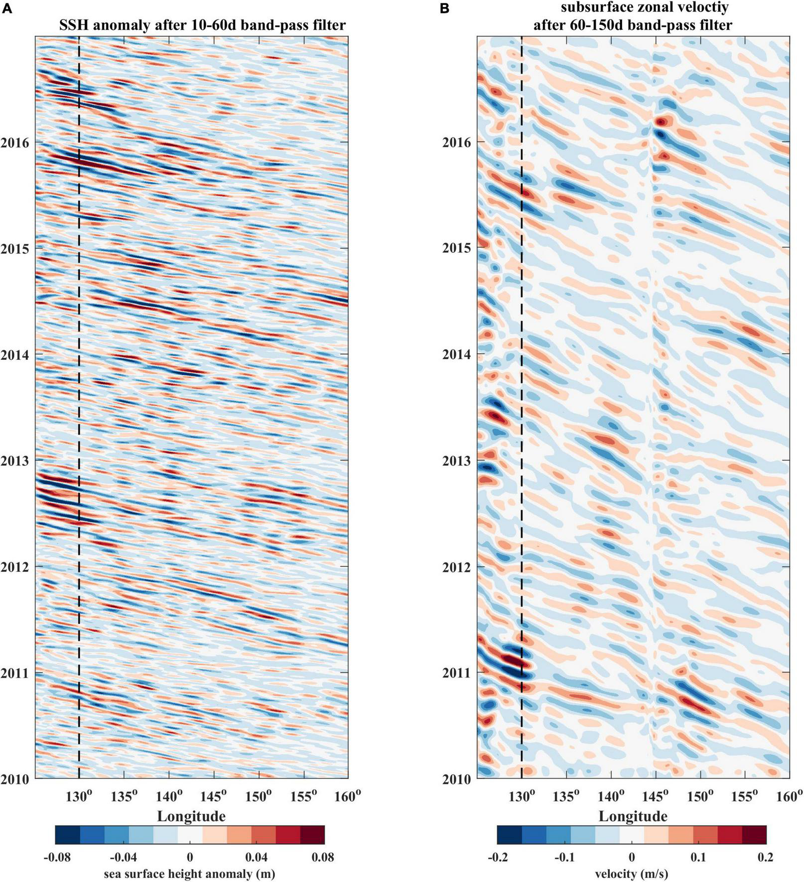 (A) Time-Longitude plot of the 10–60 days band-pass filtered SSH anomalies between western boundary and 160°E along 13°N in the WTP. (B) Time-Longitude plot of the 60–150 days band-pass filtered subsurface zonal velocity (400–600m) along 13°N between western boundary and 160 E in the WTP from OFES outputs. The dashed lines denote the location of 130°E.