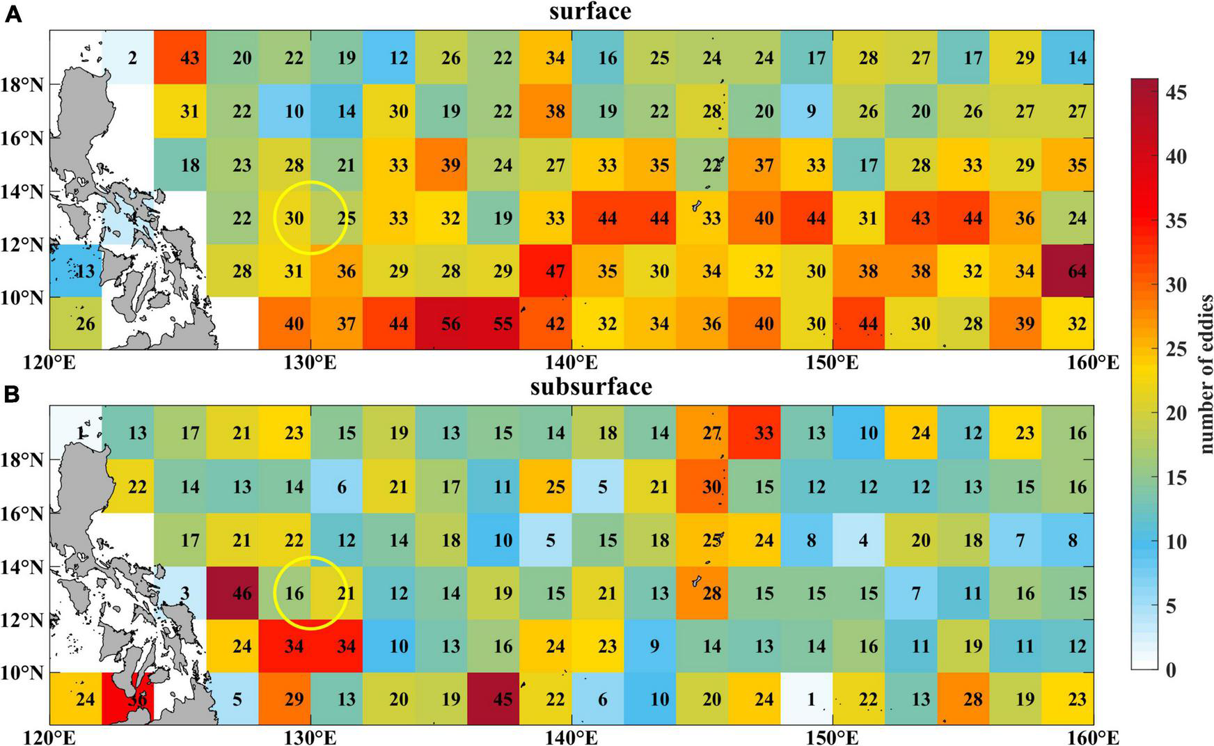 (A) Geographic distribution of the generation number of surface eddies in each 2 × 2 box based on eddy trajectory analysis using 6 years of AVISO data (2010–2016). (B) same as (A), but for subsurface eddies using OFES outputs in the same period. The yellow circle denotes the region centering at the mooring location with a radius of 150 km.