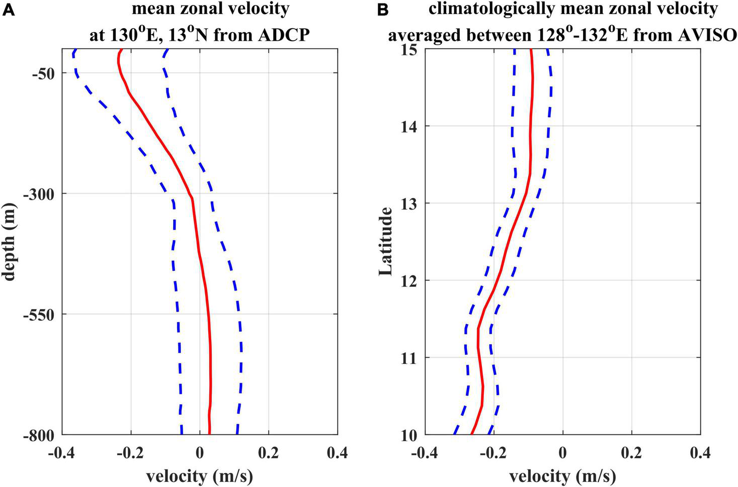 (A) Mean zonal velocity profile (red) above 800 m averaged from the mooring ADCP measurements with the standard deviation (blue), and (B) Mean zonal geostrophic velocity averaged between 128° and 132°E from 10° to 15°N derived by satellite altimetry with the standard deviation (blue).