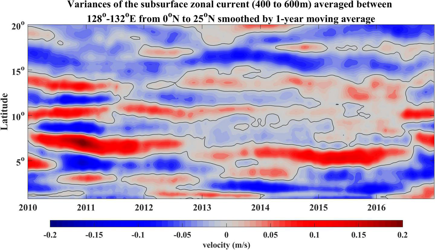 In terms of the subsurface currents, ADCP measurements suggest the vertical shear below 400 m is weak (Figure 10A). To diagnose the horizontal shear of subsurface currents in this region, we plotted the time series of subsurface zonal velocity (400–600 m) averaged between 128°–132°E during 2010–2016 (Figure 11). To focus on the low-frequency variation of the background currents, the 1-year moving average of the zonal velocity was calculated to remove the small-scale and meso-scale signals and seasonal cycle. The filtered results exhibit significant meridional shear between 10° and 15°N during 2010. Therefore, we hypothesize that the generation of the subsurface-intensified eddies or ISV may be related to the barotropic instability induced or enhanced by the intensified meridional shear of the subsurface zonal currents.