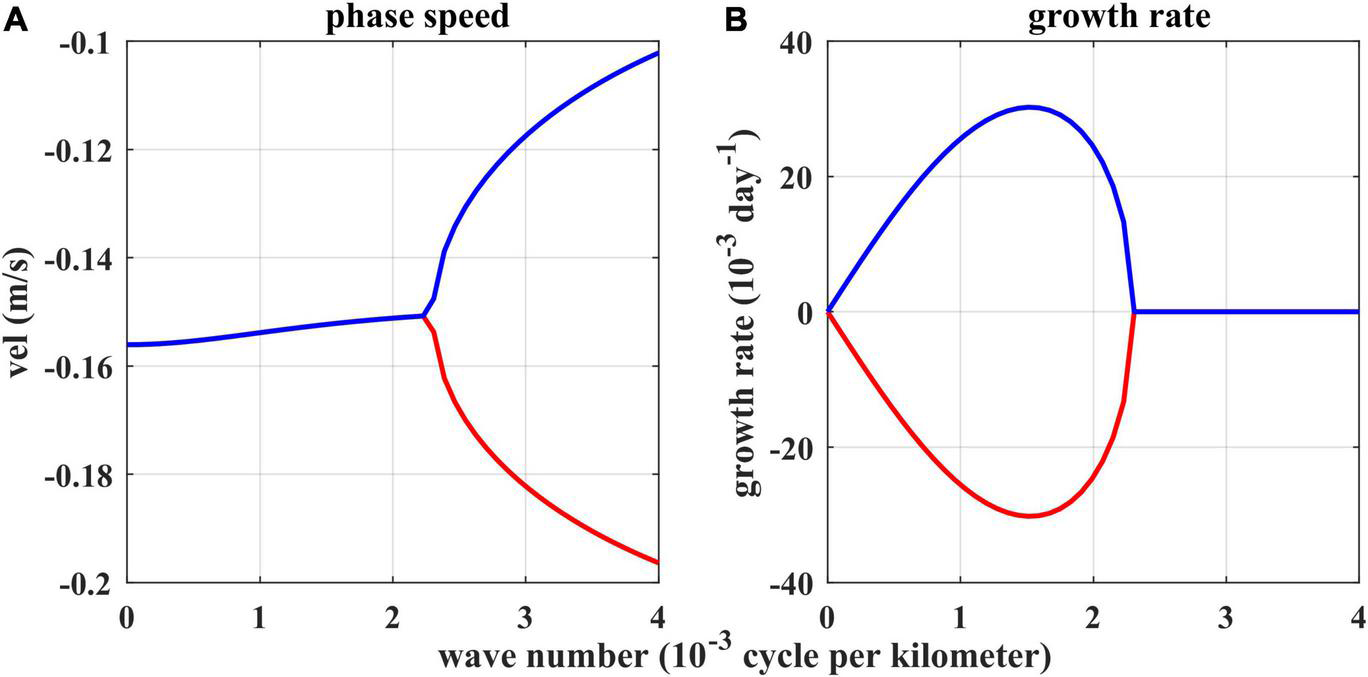 Phase speed (A) and growth rate (B) as a function of zonal wavenumber k calculated from the 2.5-layer linearized reduced gravity model.