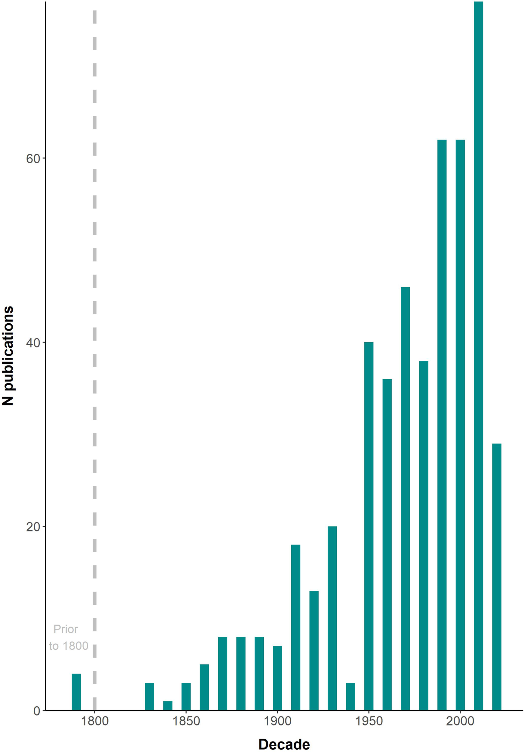 Figure 2 Number (N) of publications including data on cetacean epibiotic fauna at a decadal scale from 1655 to 2021.