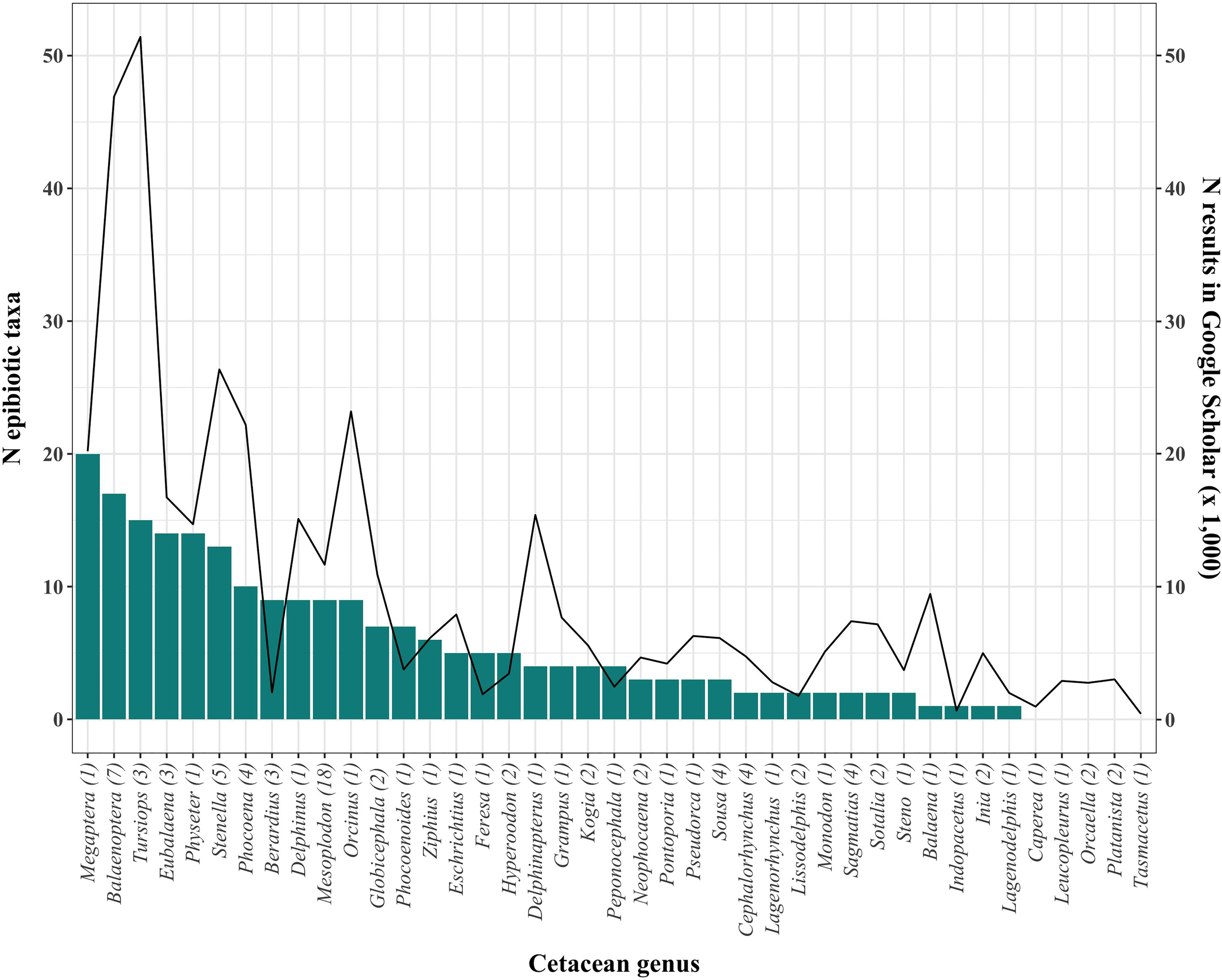 Figure 3 Number of epibiotic species (bars, left y-axis) and total number of general results in Google Scholar (line, right y-axis) of each cetacean genus. The number of cetacean species in each genus is shown in parentheses.