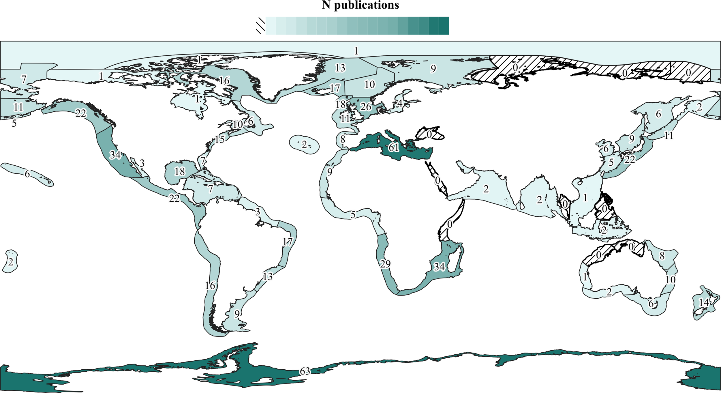 Figure 4 Number of publications (indicated by numbers and color gradient) on cetaceans that contain data on their epibiotic fauna at least to genus level grouped by Large Marine Ecosystems (LME). When the same publication includes data for several LMEs, it is counted separately for each one. Azores (NE Atlantic) and Tonga (SW Pacific) are not in the LME system but were included as additional areas.