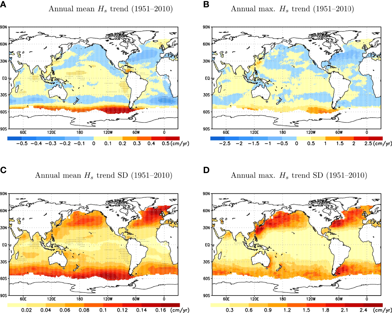 Figure 2 Ensemble average (A, B) and standard deviation (C, D) of the annual mean Hs(A, C) and maximum Hs(B, D) trend (cm/yr) for 1951–2010. Stippling indicates the ensemble mean trend is statistically significant.