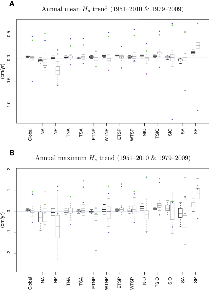 Figure 3 Ensemble average of the regional trend (cm/yr) of the annual mean (A) and maximum (B)Hs averaged over the indicated area (see Figure1), corresponding to the 1951–2010 (black) and 1979–2010 (gray) periods. Dots indicate: ERA5 (blue), ERAint (green) and CFSR (purple) corresponding values for 1979–2010. Box plot illustrates the 2.5%, 25%, 50%, 75% and 97.5% percentiles.