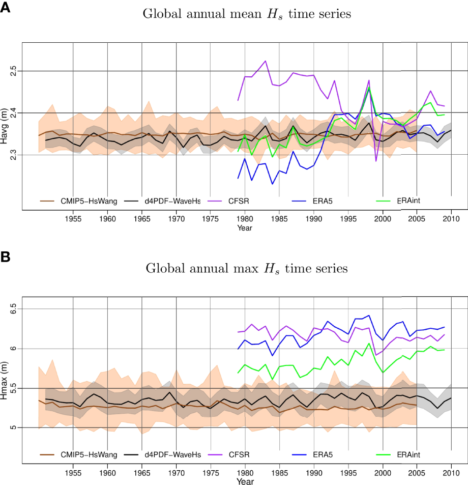Figure 4 Global time series of the annual mean Hs(A) and annual maximum Hs(B), in m, as derived from d4PDF-WaveHs (black), CMIP5-HsWang (brown), CFSR (purple), ERA5 (blue), ERAint (green). For the d4PDF-WaveHs and CMIP5-HsWang ensembles we show the ensemble mean (thick lines) and the range between the 2.5% and 97.5% percentiles (shaded area).
