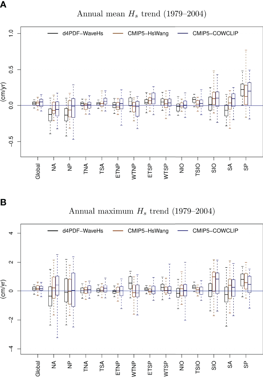 Figure 6 Ensemble average of the regional trend (cm/yr) of the annual mean (A) and maximum (B)Hs averaged over the indicated areas (see Figure 1) as derived from d4PDF-WaveHs (black), CMIP5-HsWang (brown) and CMIP5-COWCLIP (dark blue) for the 1979–2005 (see Section 2). Box plot illustrates the 2.5%, 25%, 50%, 75% and 97.5% percentiles.