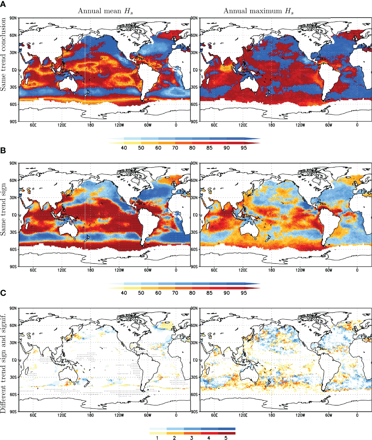 Figure 7 Fraction of ensemble members (%) with the same trend conclusion (A), the same trend sign (B) and different trend sign that is statistically significant (C), as compared to the ensemble average for the annual mean Hs (left) and the annual maximum Hs (right) (see Section 2.2 for more details). Warm(cold) shades indicate the ensemble mean trend is positive(negative). Stippling indicates the ensemble mean trend is statistically significant.