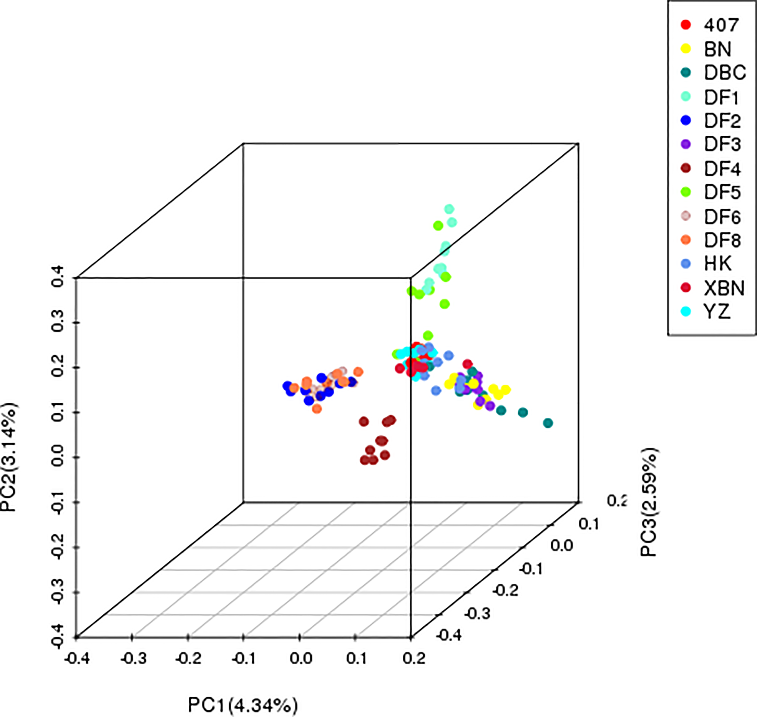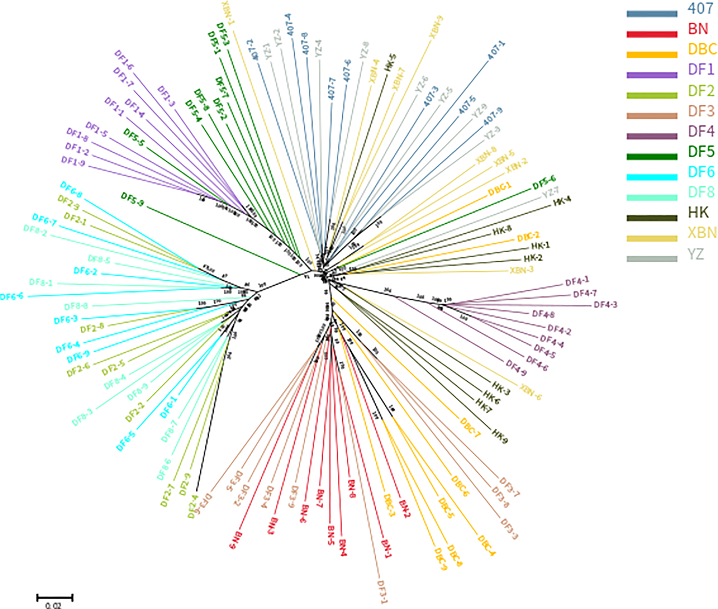 The PCA results confirmed that “HK” was widely dispersed from the YZ and XBN, providing evidence of a large diverse genetic background. DF4 is a pure and independent cultivar. DF2, DF6, and DF8 are mixed groups. DF3, BN, and DBC are also mixed. DF1 and DF5 in relationship are near with each other.
