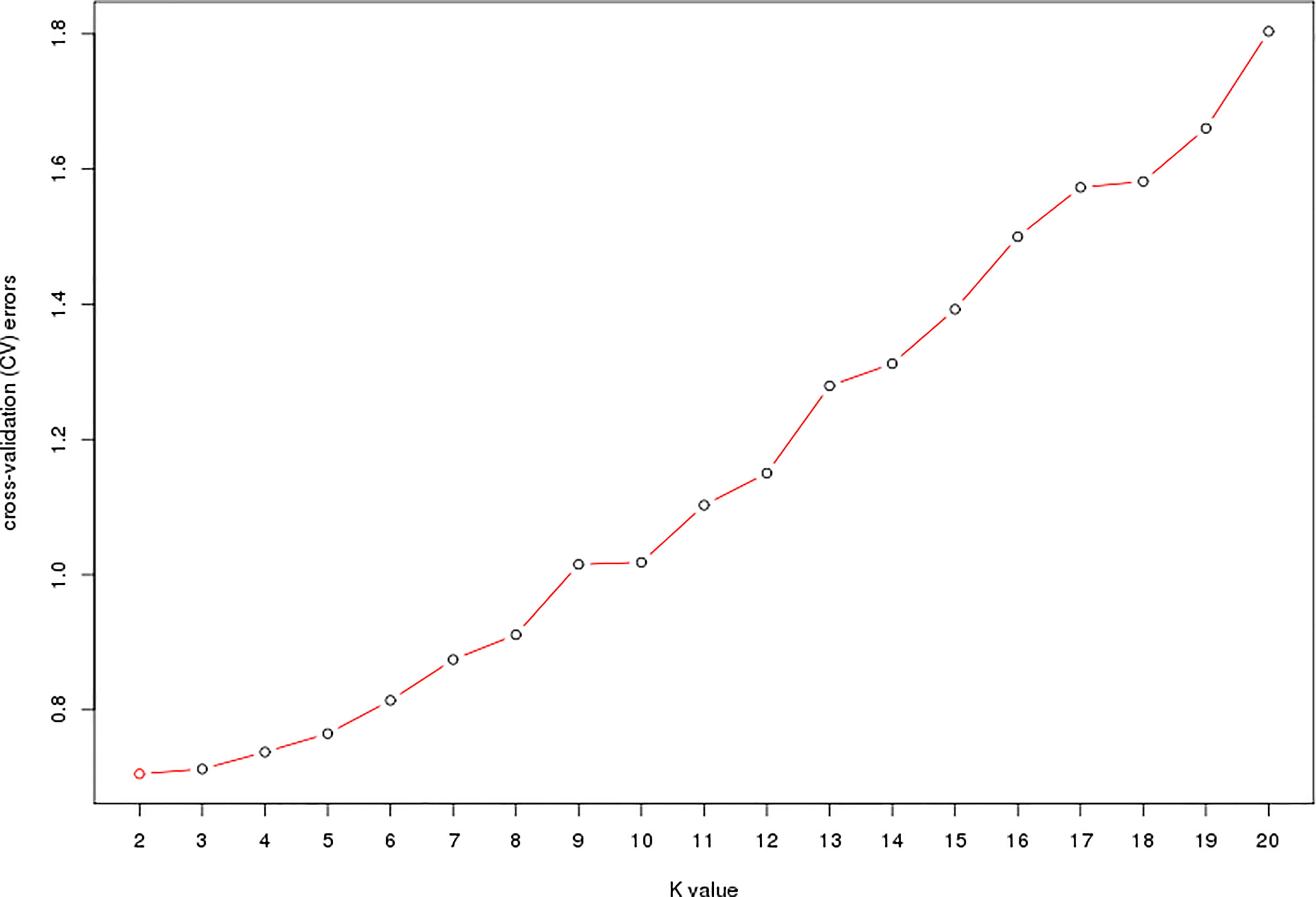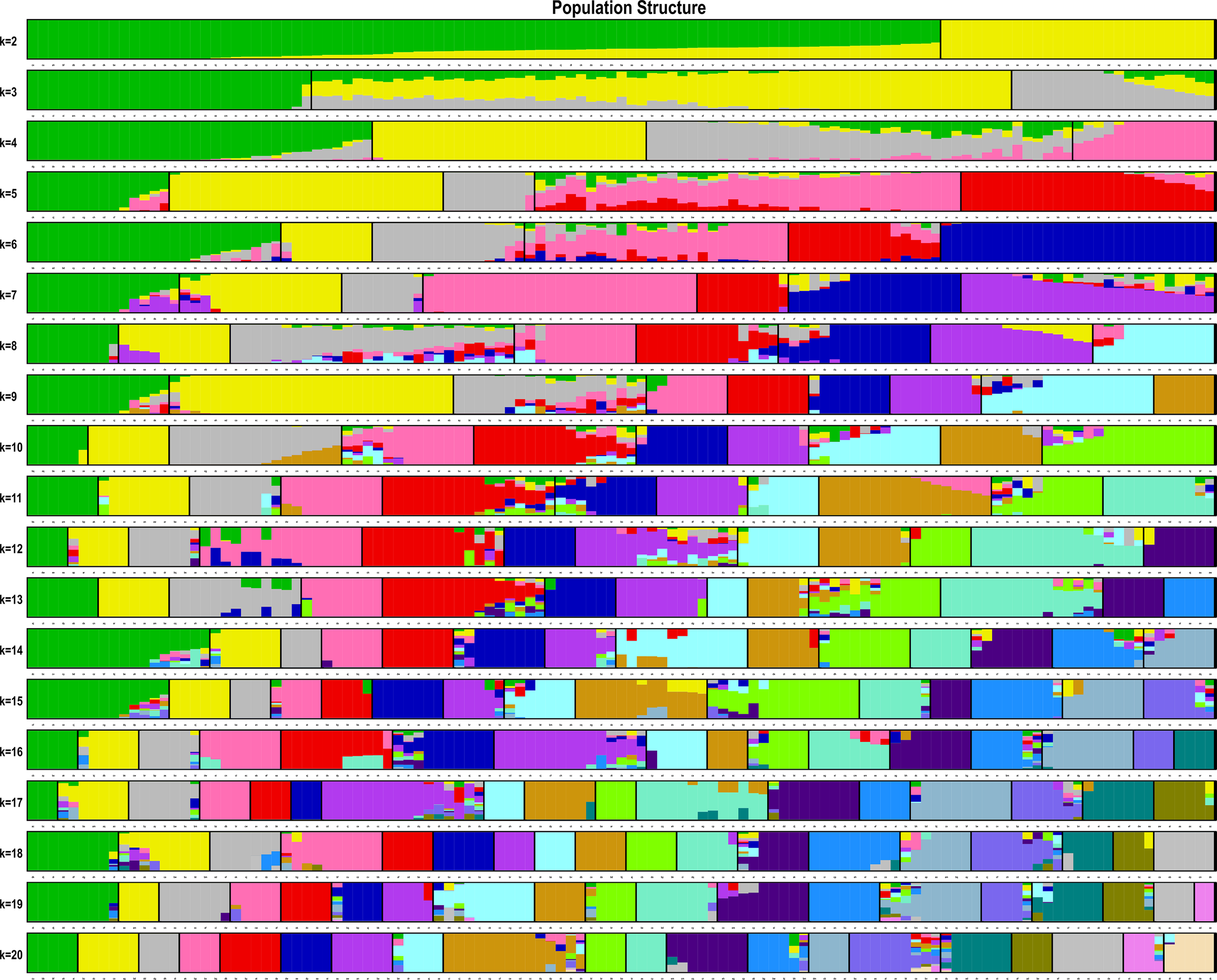 ADMIXTURE estimation of the number of groups for K values ranging from 2 to 20.