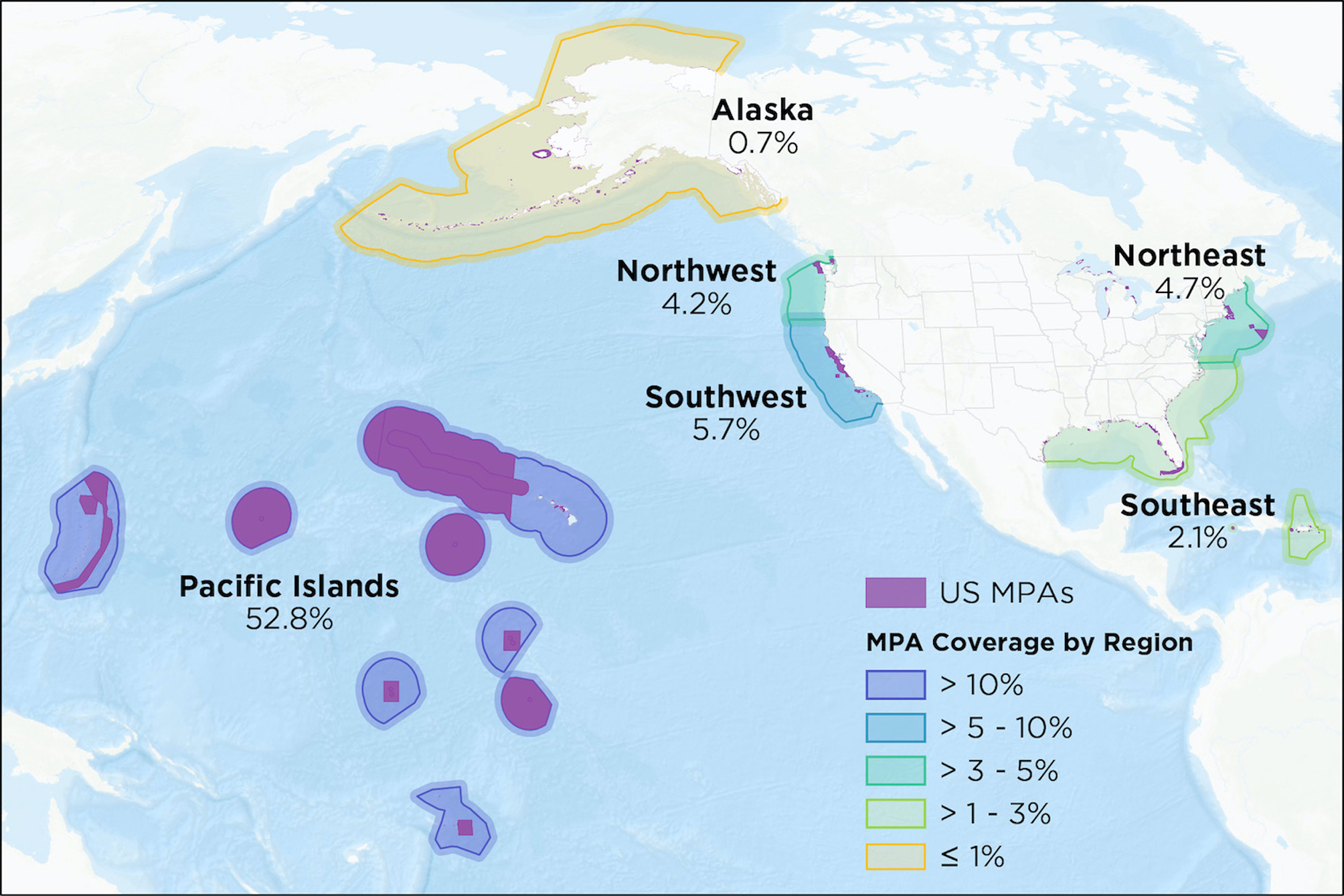 Percent marine area in any kind of implemented MPA by U.S. Region.