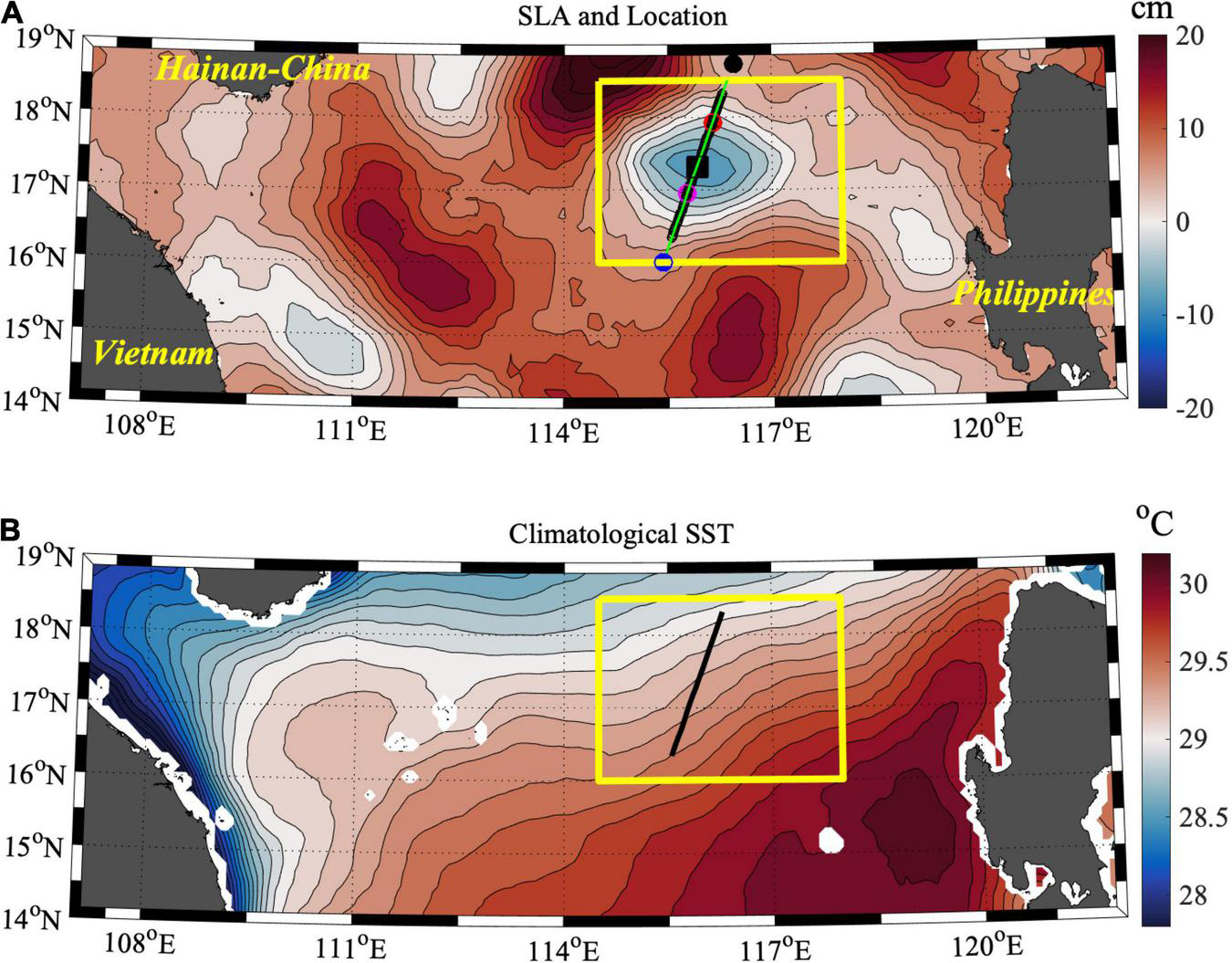(A) Two-day (May 6 and 7, 2021) mean sea level anomaly (SLA, unit: cm) in the central SCS with a contour interval of 2 cm. The SLAs in the yellow frame highlight the specific cyclonic eddy in this study, and the green line across the center of the eddy indicates the cross-section of the ship-borne air-sea measurements. The black square indicates the eddy center (115.9°E, 17.3°N) with the maximum negative SLA. The colored dots along the track indicate the sounding balloon observations to obtain the vertical profile of meteorological variables at the standard times of UT050617 (LT050701, black dot), UT050623 (LT050707, red dot), UT050705 (LT050713, magenta dot) and UT050711 (LT050719, blue dot). The dynamics of the stimulated imbalance inside the cyclonic eddy are investigated using MVP 300 observations (black circles) in another study (Song et al., 2022). (B) Nineteen-year climatological MWIR SST in May from 2003 to 2021.