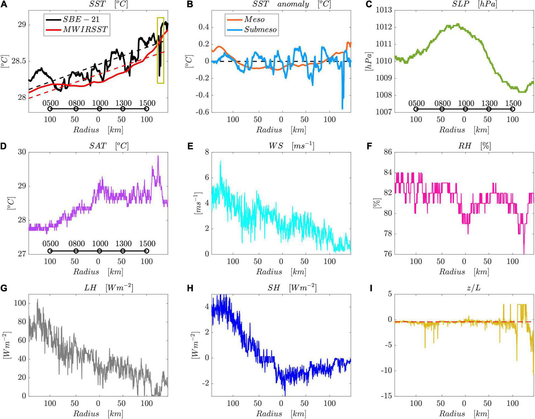 Cross-sectional air-sea variables across the cyclonic eddy shown in Figure 1, including the raw SST (A, unit:°C), SST anomalies (B, unit:°C), SLP (C, unit: hPa), SAT (D, unit:°C), WS (E, unit: ms–1), RH (F, unit:%), LH (G, unit: Wm–2), SH (H, unit: Wm–2) and stability parameter of MABL ζ = z/L, with ζ = −0.4 denoted by dashed red lines (I). Raw SST and its linear front demonstrated by solid and dashed lines in (A), respectively. The satellite-based mean south-north SST variations (solid red) and their trend (dashed red) are averaged over 10 days before and after the cross-sectional ship observations. The yellow frame in (A) highlights the strong variations in the raw SST within a short distance. SST anomalies (B) associated with meso- and submesoscale motions are decomposed (Eq. 2) and shown by orange and blue lines, respectively. The horizontal line with black circles (A,C,D) indicates the local observation time. The x-axis represents the radius of the mesoscale eddy with the center at approximately 115.9°E, 17.3°N.
