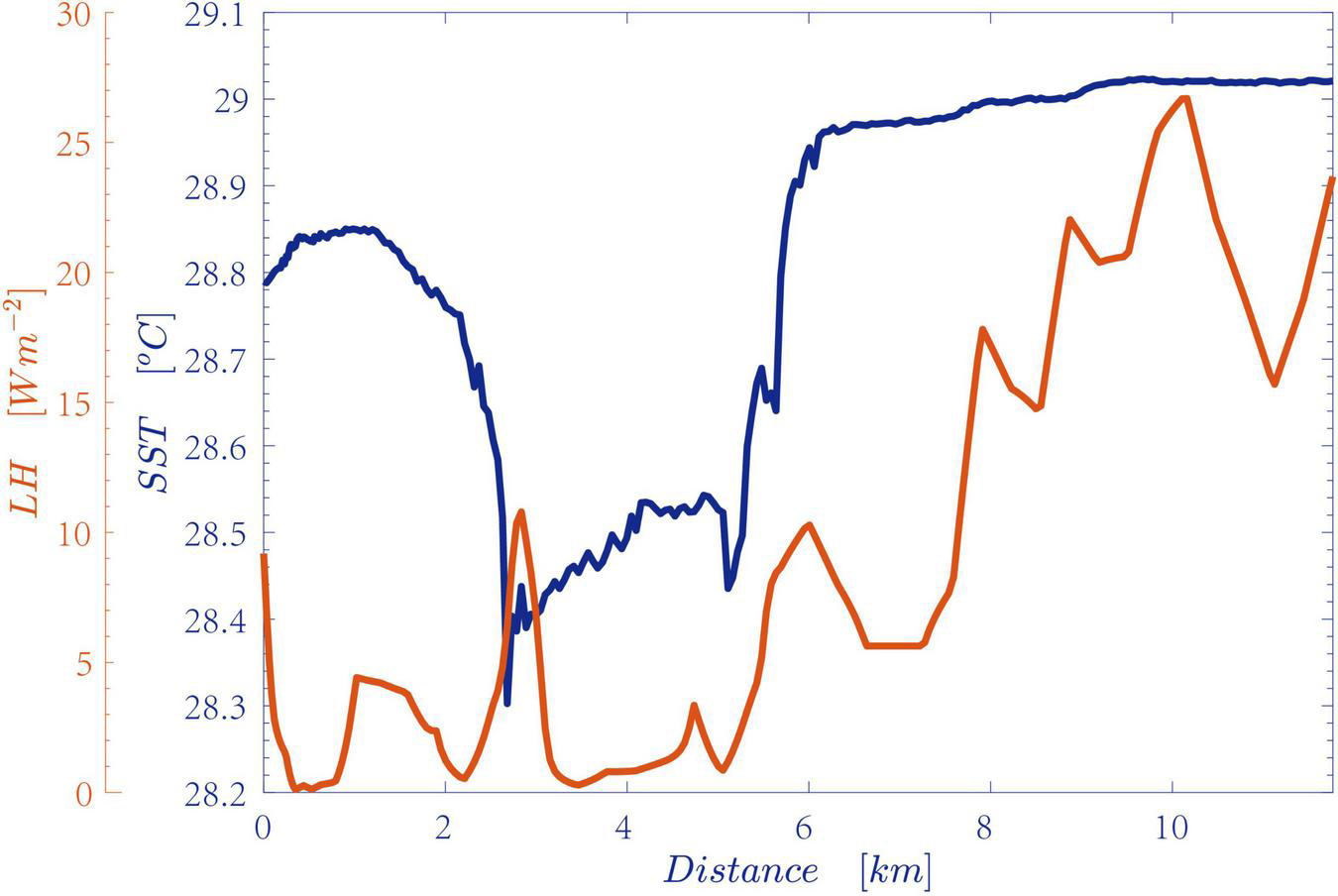 The sea level pressure (SLP) shows a diurnal variation (Figure 2C) that ranges from 1,008 to 1,012 hPa. A minimum pressure is found in the afternoon associated with the strongest surface heating, as indicated by the surface air temperature (SAT, Figure 2D). A maximum SAT of ∼30°C and a minimum relative humidity (RH) of 76% occur accordingly. The wind speed (WS) decreases from 7 ms–1 to less than 1 ms–1 when the vessel heads south. Using the above meteorological variables and the SST, the air-sea turbulent heat fluxes can be estimated by bulk formulas of the Coupled Ocean-Atmosphere Response Experiment (COARE) 3.5 (Edson et al., 2013). The heat fluxes are calculated using the absolute WS ( in Eq. 1) rather than the relative WS with reference to the surface currents because the surface currents are weak at a magnitude of ∼O(0.1) ms–1. The estimated LH shows a significant decrease of approximately 100 Wm–2 from north to south, following a weakened WS. Even though the LH is lower in the south with weaker WS, an anomaly in LH is approximately 25 Wm–2 accompanied by a sudden anomaly in SST, which increases by 0.9°C within ∼3.6 km (Figure 3). The sensible heat flux ranges from −2 to 4 Wm–2 and is associated with a weak air-sea temperature difference. The negative sensible heat flux values indicate an inverse air-sea temperature difference when the SAT is higher than the SST. Given the weak magnitude compared to the LH, sensible heat flux anomalies are not investigated in this study.
