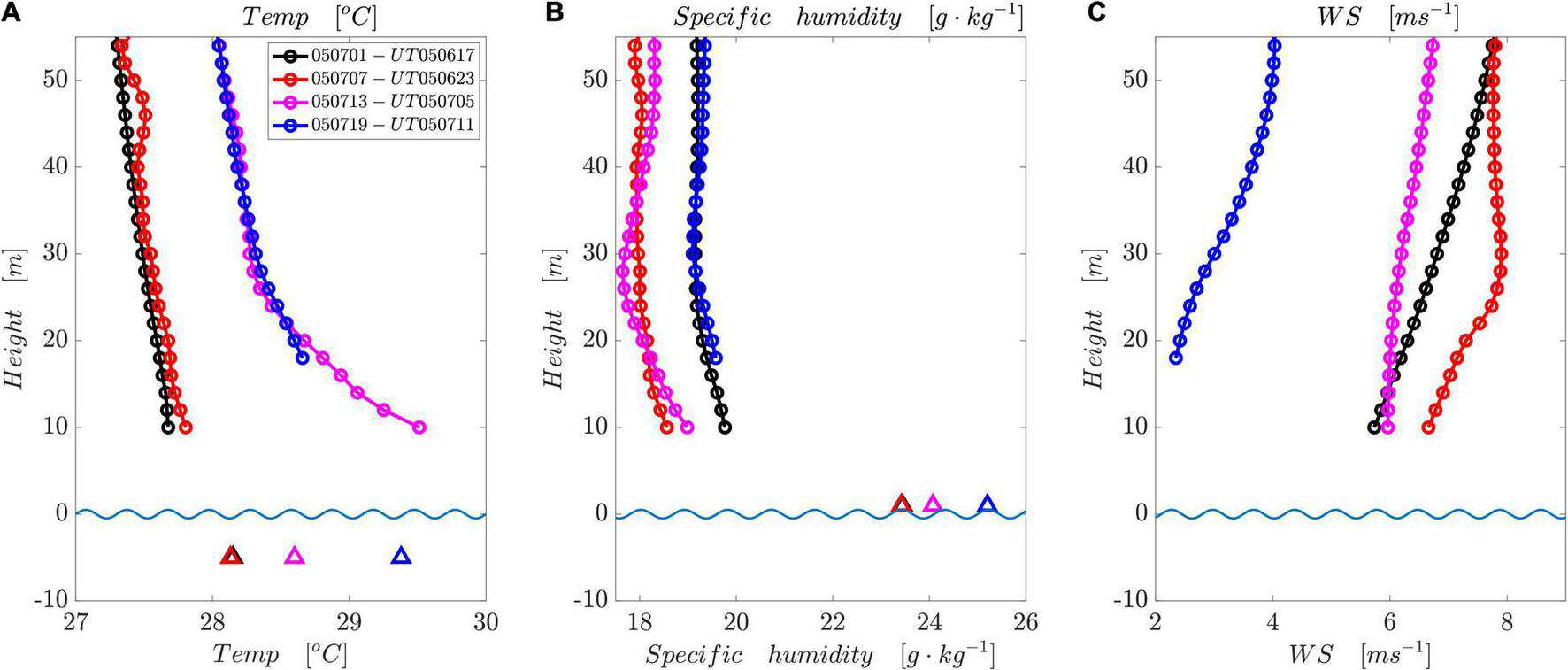 Vertical profiles of the following atmospheric variables: air temperature (A, unit:°C), specific humidity (B, unit: g⋅kg–1) and WS (C, unit: ms–1). Different colors indicate different observation locations every 6 h across the cyclonic eddy (Figure 1). Only the variables in the lower atmospheric boundary layer are shown for better visualization. The SST values are denoted by triangles with the same color as the corresponding meteorological measurements. The near-surface humidity is calculated using the SST based on saturation with a 2% reduction considering a salinity effect: qs = 0.98×qsat(θ, SLP). The light blue wavy lines indicate the schematic sea surface.