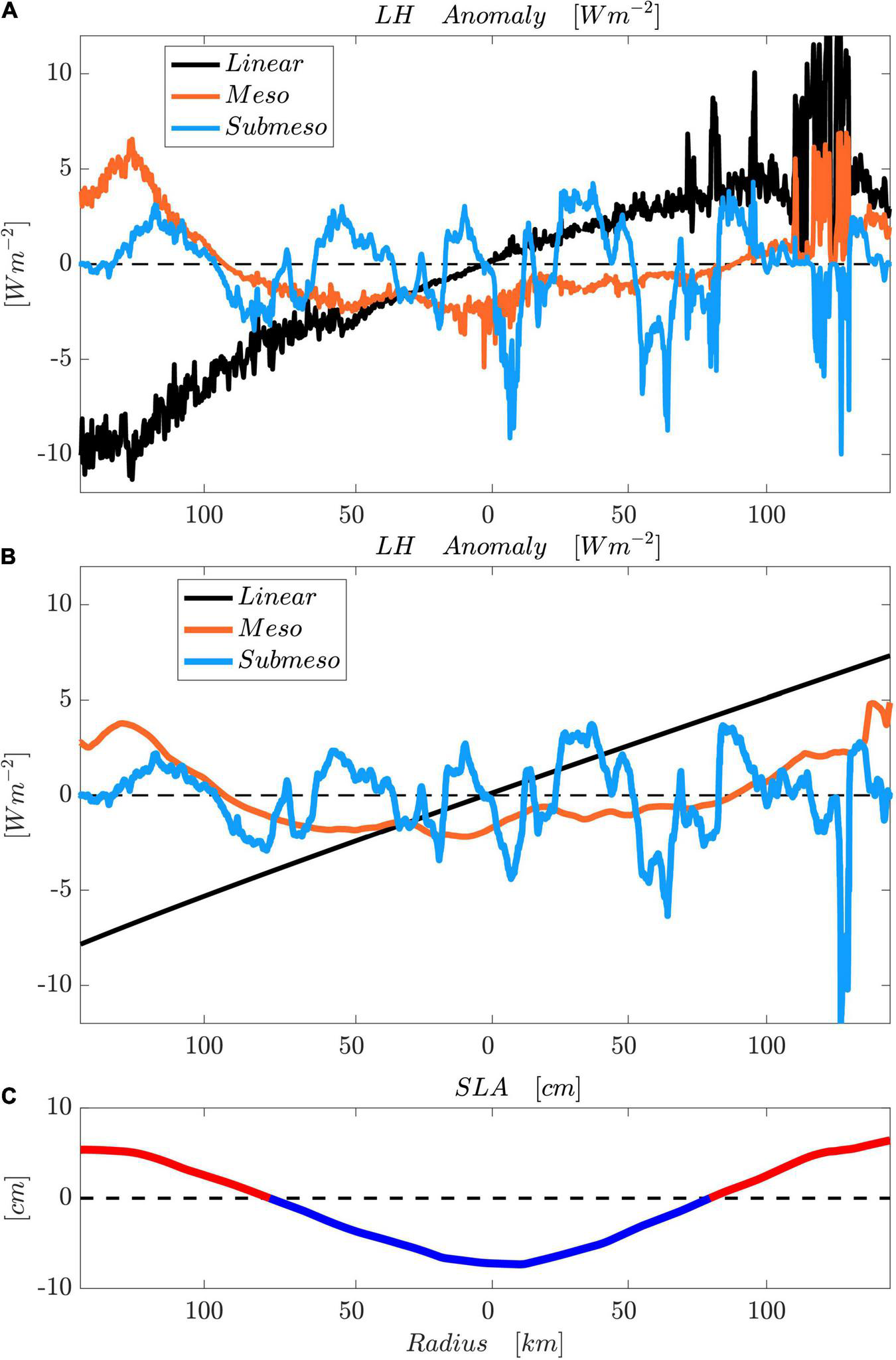 The other meteorological parameters used to estimate the LH are set to be the same for and . A similar relation can be used to obtain the LH anomalies associated with submesoscale processes (or large-scale linear front in Figures 1B, 2A) by replacing θmeso with θsubmeso (θlinear). In addition, the LH anomalies associated with the submesoscale processes can be also estimated by the following relation: