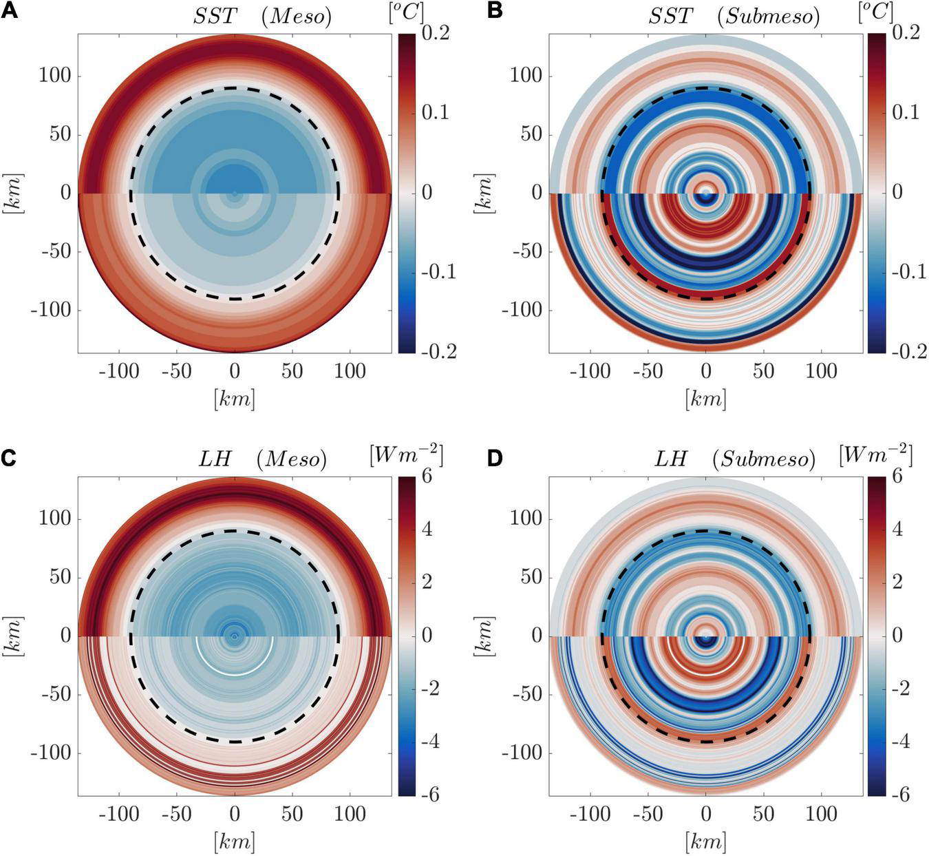 Schematic circular patterns of anomalies in SST (A,B) and LH (C,D) induced by meso- and submesoscale processes applying cross-sectional observations to circular structures. The black dashed circular rings indicate the radius of the cyclonic eddy at approximately 90 km.