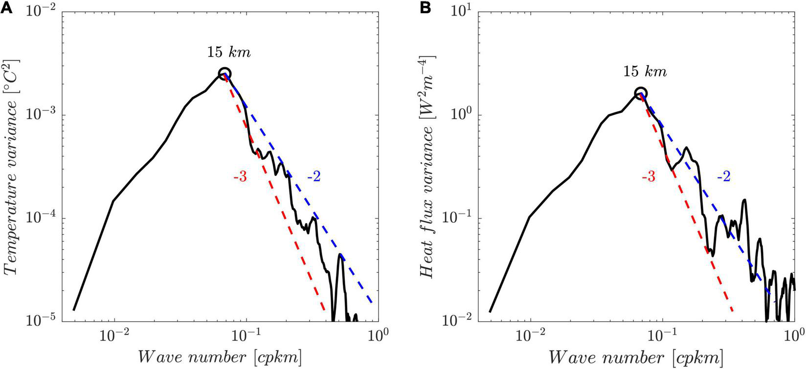 Power spectral densities (PSDs) of the (A) SST anomalies (Figure 2B, blue) and (B) LH anomalies (Figure 5A, blue) associated with unbalanced submesoscale motions. The peak wavelengths are marked by circles. The slopes of k–2 (dashed blue) and k–3 (dashed red) are incorporated for reference.