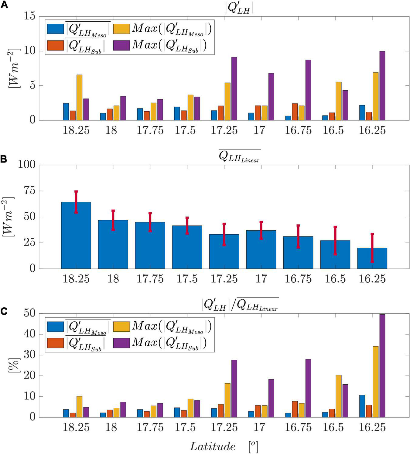 The mean LH anomalies () induced by meso- (blue and yellow bars) and submesoscale (red and purple bars) processes averaged over standard latitudinal grids with a spatial interval of 0.25°. (A) The mean absolute values of the anomalies along with the maximum values (yellow and purple bars) induced by meso- and submesoscale processes (summarized numbers of Figure 5A). (B) The mean LH () in each latitudinal grid estimated based on realistic atmospheric variables and linear south-north SST fronts (θlinear) without meso- and submesoscale effects. The errorbars (red) indicate the standard deviations for spatially averaged grid values. (C) The ratio (percentage) of the mean LH anomaly (, A) to the mean LH (, B) in each grid.