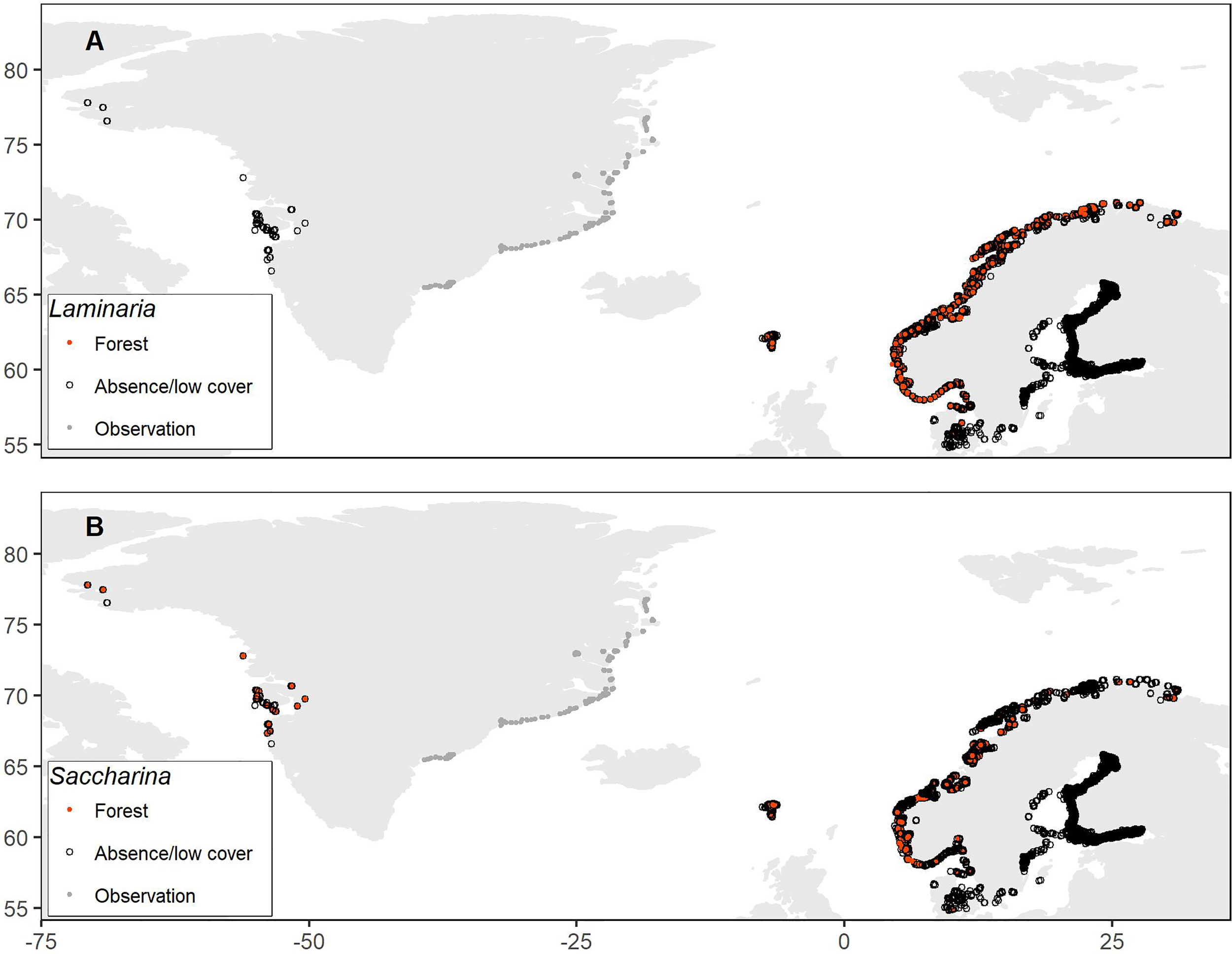 Observed presence or absence of kelp forests (dense or moderately dense forest) of the genera Laminaria(A) and Saccharina(B) across the Nordic region, obtained from quantitative or semi-quantitative data on coverages or densities. For the east coast of Greenland, only the locations of observations are depicted (the original data are unpublished).