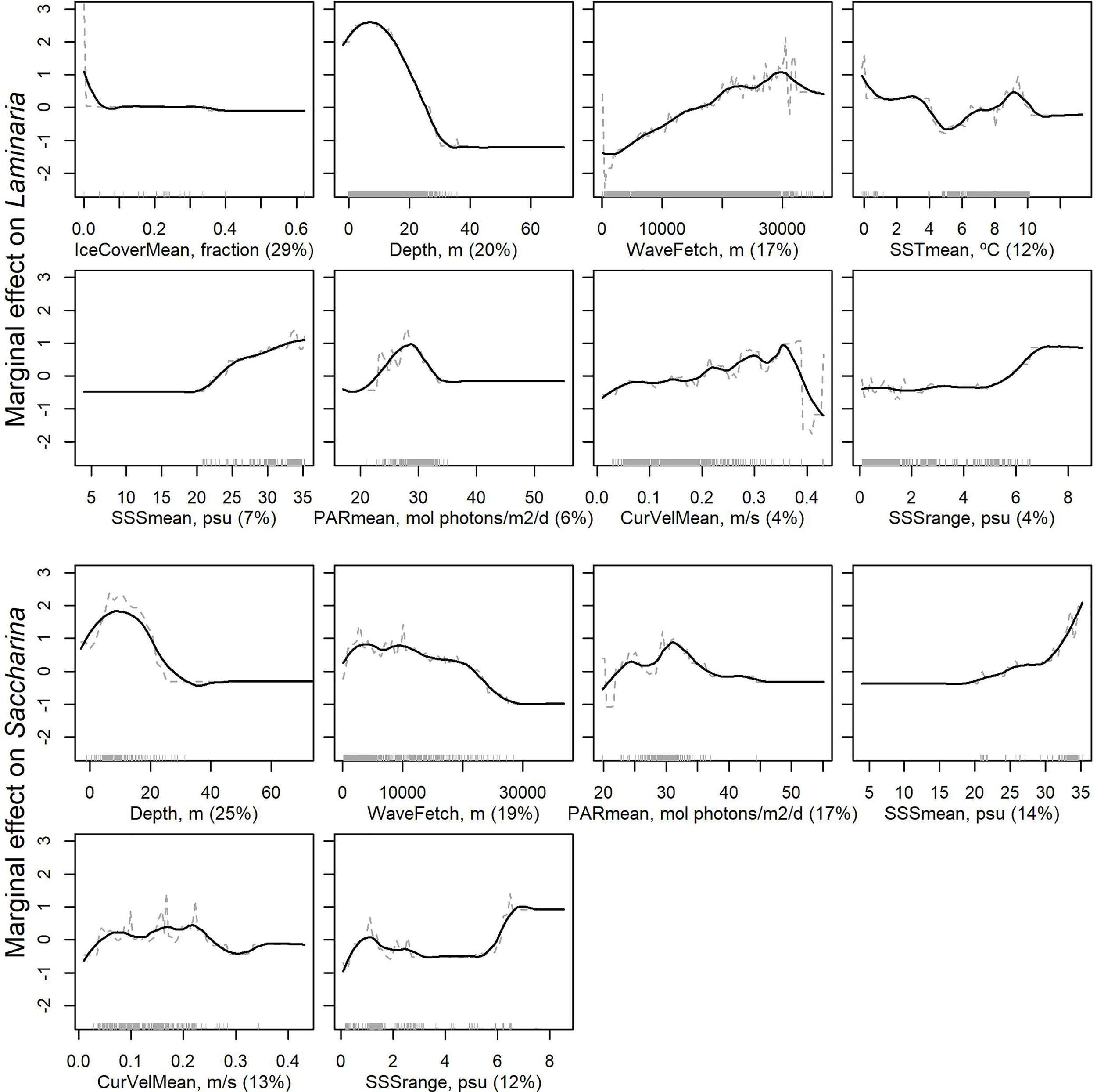 Partial dependence of presence of Laminaria (two upper rows) and Saccharina (two lower rows) forests to the environmental variables kept in the final models, sorted according to degree of influence. The plots show the effect of a variable after accounting for the average effects of all other variables in the model. Grey dashed lines show the marginal effect of the variable and solid black lines give a smooth representation of the response. Numbers in brackets provide the relative contribution of the given variable. The grey rug on the x-axis shows the location of data with recorded presence of Laminaria or Saccharina kelp forest, while the x-axis range is determined by the full datasets including absences.