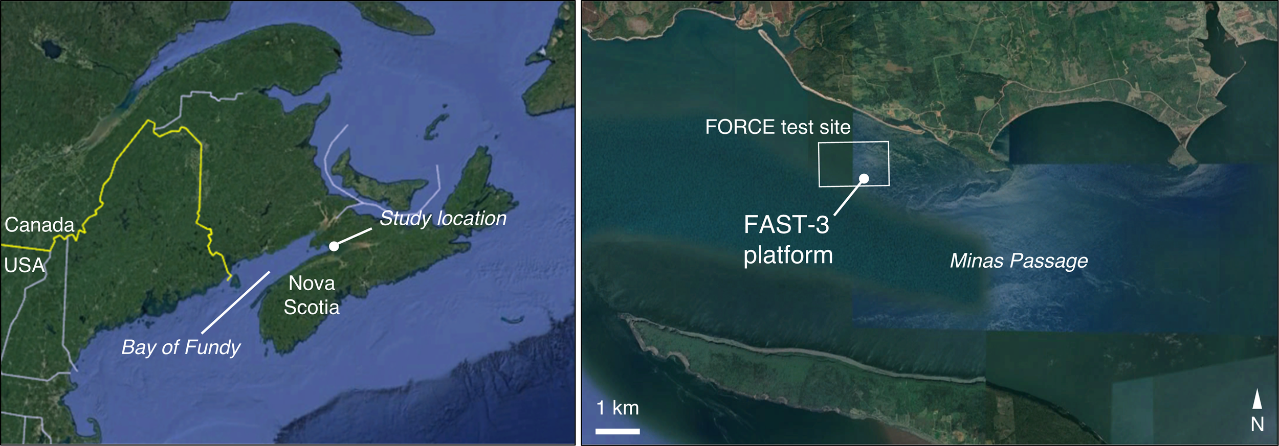 Data were collected at the Fundy Ocean Research Center for Energy (FORCE) tidal energy test site, in the Bay of Fundy, Nova Scotia, Canada (Figure 1). Instruments were installed on the Fundy Advanced Sensor Technology subsea platform, FAST-3 (Figure 2). This stationary platform was deployed on the seafloor at 45°21’47.34” N, 64°25’38.88” W, and was in place for 53 days from 30 March to 23 May 2018. At this location, water column depth averaged 33 m at low tide and 43 m at high tide.