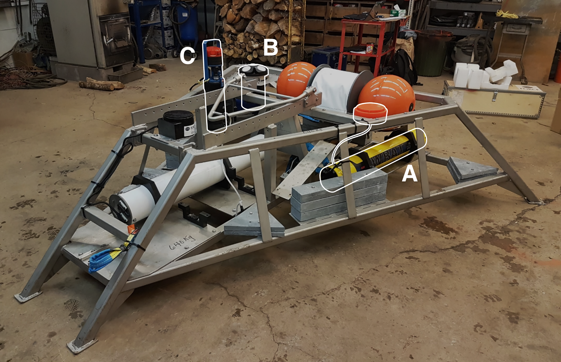 FAST-3 platform deployed at the FORCE Tidal energy test site from 30 Mar to 23 May 2018. Equipment included (A) Simrad WBAT EK80 echosounder, (B) Nortek Signature 500 ADCP, (C) Aanderaa SeaGuard RCM.