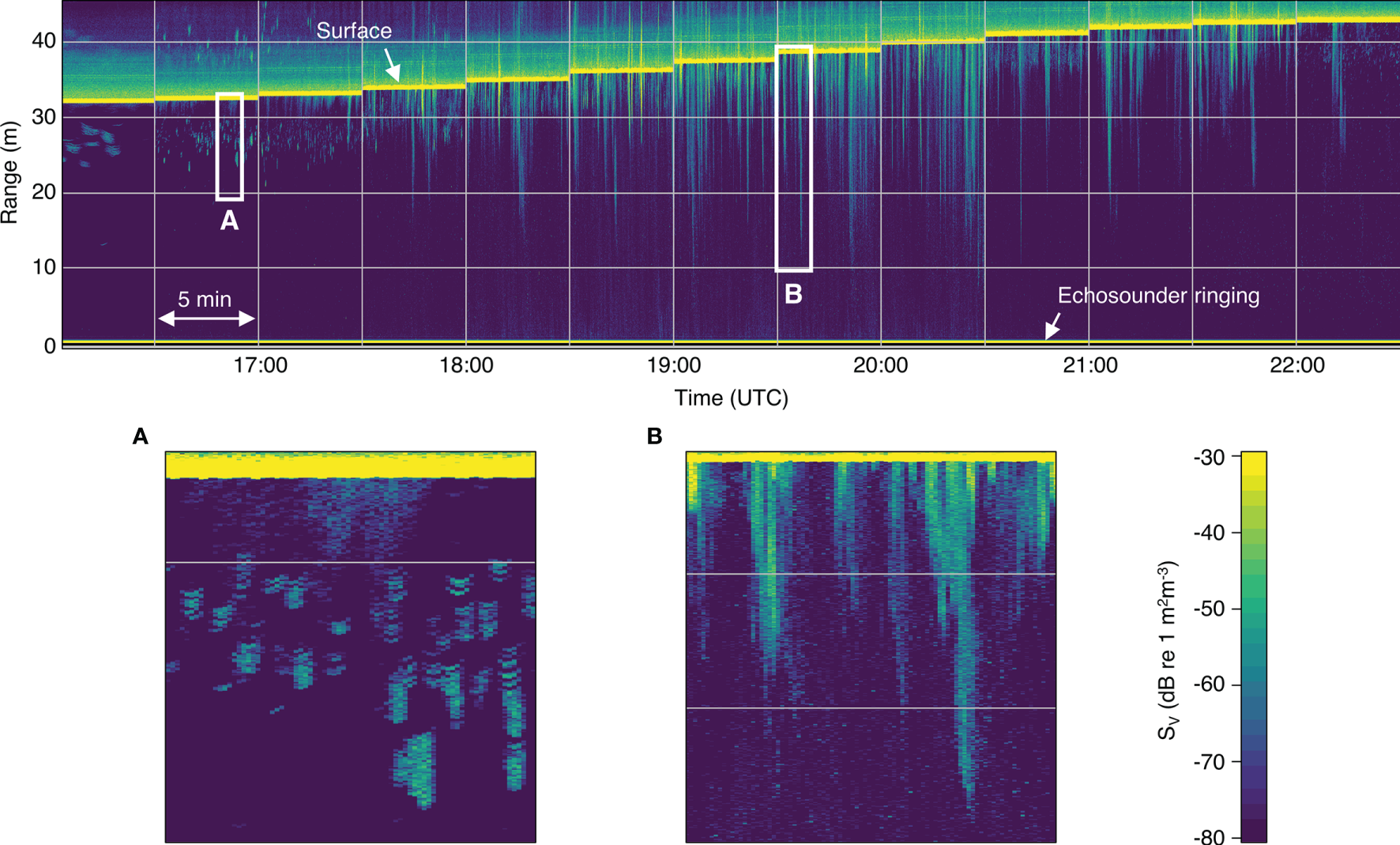 Volume backscatter (SV) echogram from a typical flood tide (on 22 May 2018). Low tide is on the left and high tide is on the right. Vertical gridlines separate the 5-min echosounder recording periods, which began every half hour (times shown in UTC). Horizontal gridlines indicate 10-m range bins (measured upwards from the transducer face). All following echograms use the same grid and color scale shown here. (A) Backscatter from small aggregations of fish visible near the surface near low tide. (B) Bubble plumes extending far into the water column during the peak flow.