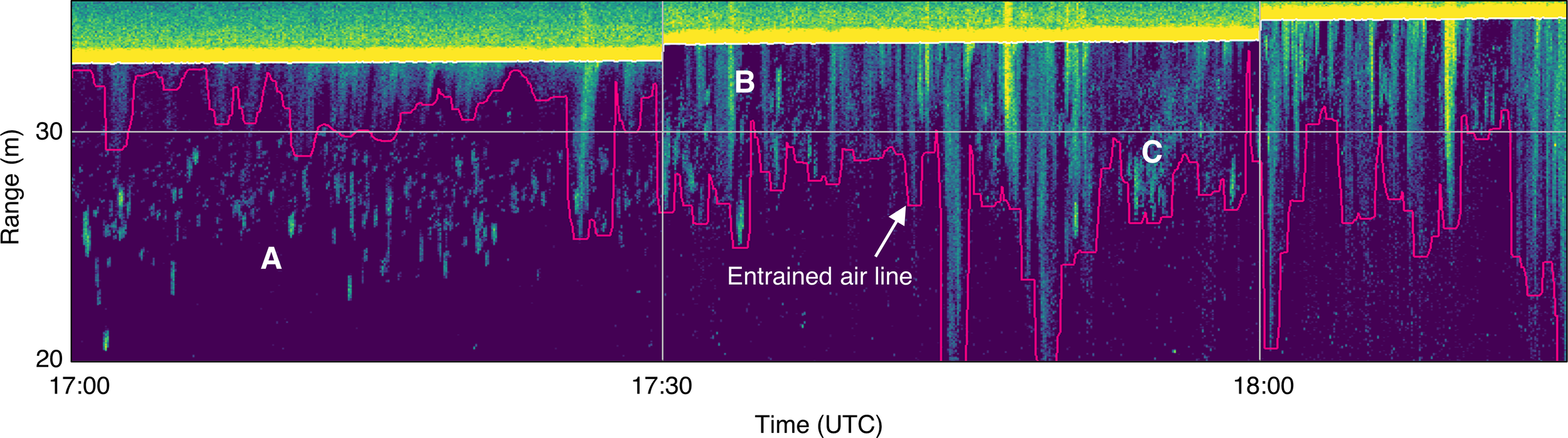 Subset of echogram shown in (Figure 3), showing backscatter from fish and entrained air (delineated by pink line). (A) Small fish aggregations clearly visible in upper water column, separate from entrained air layer. (B) Aggregations appear to shift upward into entrained air layer, where they can still be seen. (C) Unclear whether backscatter is from fish aggregations or detached/dispersed bubble plumes.