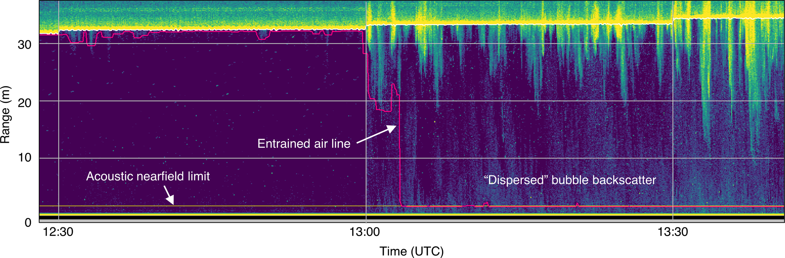 Example of backscatter from bubbles entrained throughout the water column. The detected entrained air line (pink) extends to the acoustic nearfield (horizontal yellow line), resulting in omission of most or all of the water column.