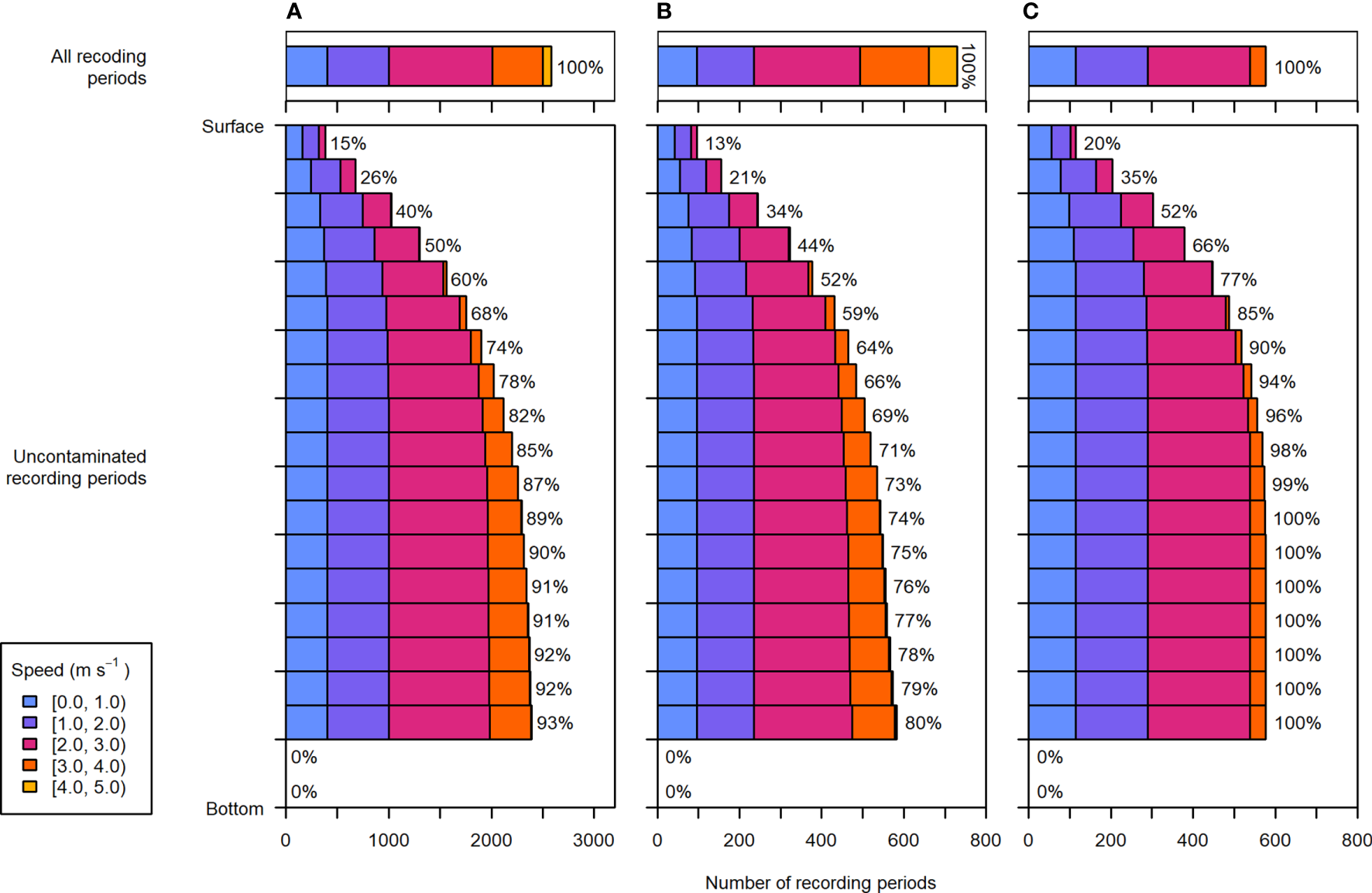 Distribution of depths and current speeds sampled during (A) the entire dataset, (B) recording periods within 2 days of spring tides, and (C) recording periods within 2 days of neap tides. Upper panels: the current speeds recorded during all periods of the respective data subset, representing speeds that would be sampled throughout the water column if there were no contamination from entrained air. Lower panels: the depth and current speed distribution of uncontaminated recording periods. Each depth bin spans 5% of the water column (the lowermost two depth bins were not sampled in any recording periods due to the height of the nearfield exclusion above the sea floor). To the right of each bar is the percentage of total recording periods within the respective data subset (e.g., entire dataset, spring tide, or neap tide).