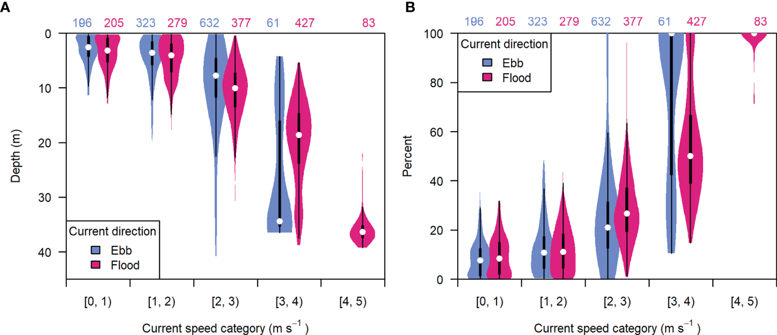 The distribution of (A) entrained air depth and (B) percent of analyzable samples missing from each recording period, grouped by current speed category and tidal current direction (ebb or flood). Light blue indicates ebb tide, dark pink indicates flood tide. White points are the median value, boxes span the interquartile range (IQR), whiskers extend to 1.5*IQR, and violins span the minimum and maximum values in each group. Numbers at the top indicate the number of recording periods in each group.