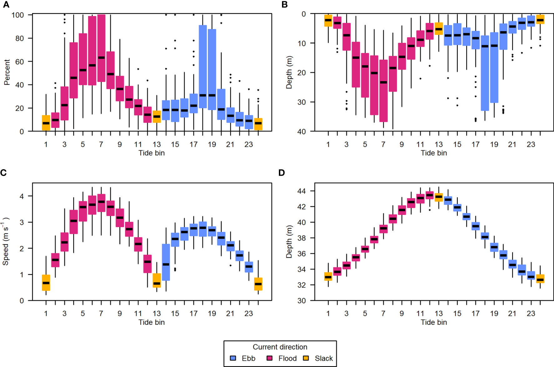 Data from all recording periods summarized by position in the tidal cycle. (A) Percent of analyzable samples missing due to entrained air contamination, (B) depth of entrained air layer relative to the surface, (C) water column mean current speed, and (D) water column total depth. The tidal cycle was divided into 24 equal bins, each spanning approximately half an hour. Light blue indicates ebb tide, dark pink indicates flood tide, and yellow indicates the tide bins containing slack tides. Horizontal black lines are the median of each group, boxes span the interquartile range (IQR), whiskers extend to 1.5*IQR, and points are outlying values.