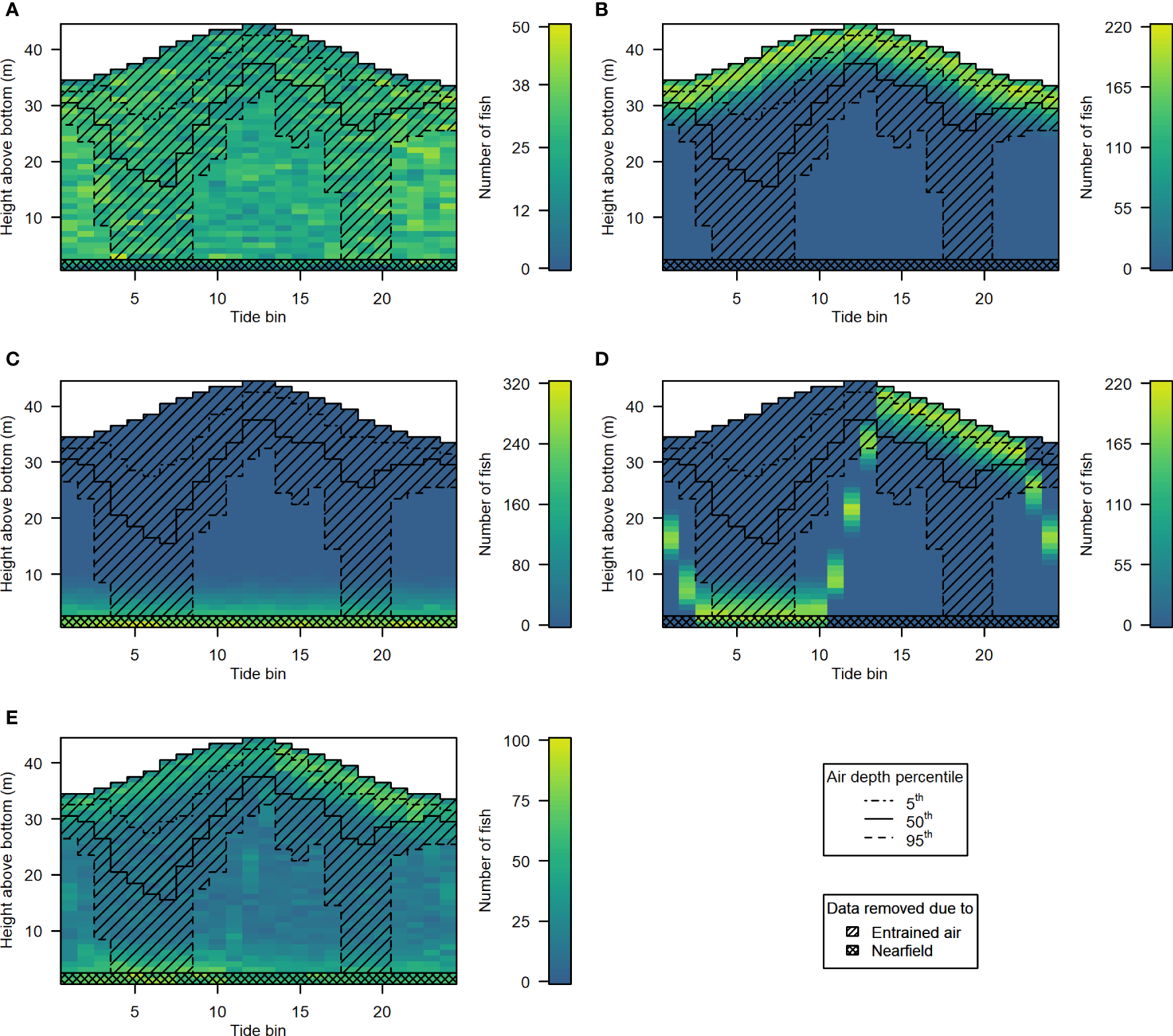 Hypothetical fish distributions generated for scenarios 1 to 5 [(A-E), respectively]. Color indicates the number of fish in each depth bin. Datapoints excluded by the 5th (dot-dash line), 50th (solid line), and 95th (dashed line) percentile depth of the entrained air layer are indicated by the hatched area. The crosshatched rectangle covering the lowermost 2 m of the water column indicates the data that would be omitted due to the height of the acoustic nearfield above the sea floor.