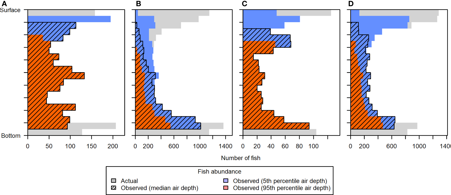 Vertical distribution of fish in simulated distribution Scenario 5, during (A) low, (B) flood, (C) high, and (D) ebb tide. The “actual” vertical distribution (light gray) is overlaid by the vertical distributions that would be observed under different levels of contamination by entrained air: 5th percentile air depth (blue), 50th percentile air depth (hatched), and 95th percentile air depth (dark orange). Each depth bin spans 5% of the total water column depth, to facilitate comparison across tidal changes in water level. Fish counts in the lowermost two depth bins were primarily reduced due to the height of the acoustic nearfield above the sea floor.