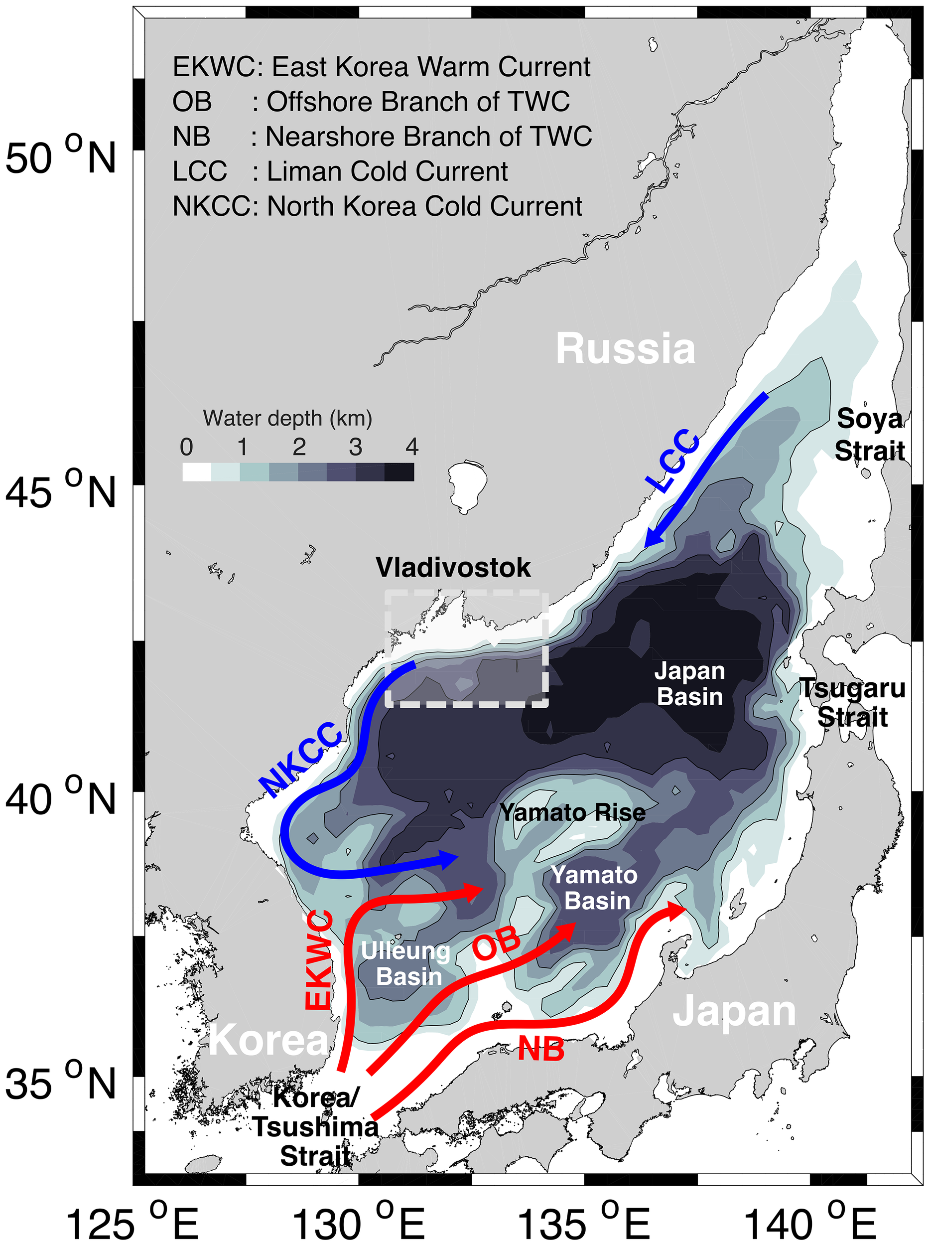 Bathymetry and a schematic major surface currents in the East/Japan Sea. The dashed-box indicates the area where deep convection occurs.