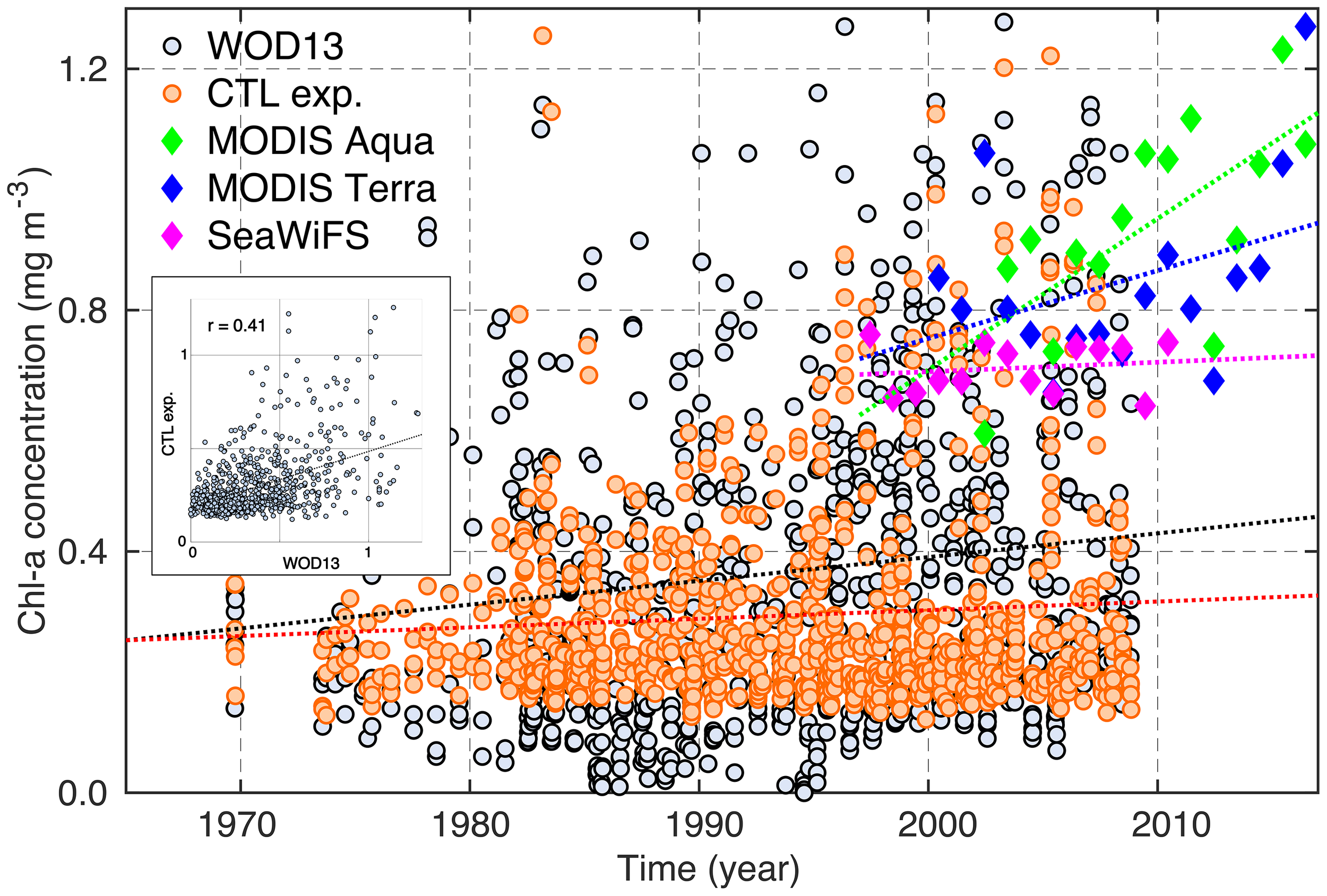 Time series of the surface chlorophyll-a (Chl-a) concentration. The orange circles indicate simulated Chl-a concentration values (the control experiment: CTL exp.), which were selected to correspond to the closest location and date relative to the in situ observation data (World Ocean Database 2013: WOD13). The gray circles and green, blue, and magenta squares show the in situ and satellite measurement data, respectively. The satellite data are represented by annual mean values. The dotted lines denote the linear regression lines of each dataset. The long-term tendencies of the Moderate Resolution Imaging Spectroradiometer (MODIS) Aqua, WOD13 and model data are statistically significant at the 95% confidence level (p < 0.05). The inset scatter plot compares the Chl-a concentration between the WOD13 and the CTL experiment.